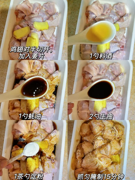 1️⃣鸡翅对半切开,参考图片☝️腌制15分钟