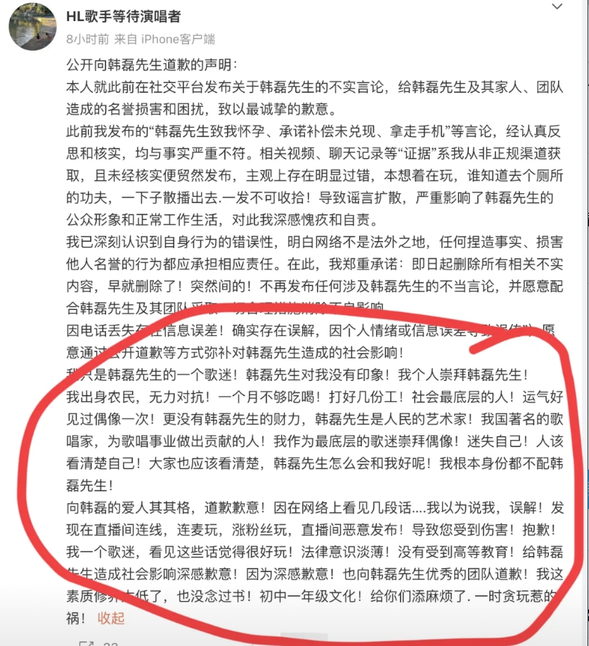 看了造谣韩磊的当事人道歉信,有三点琢磨起来,很有意思。