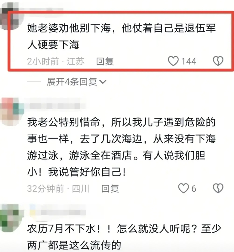 男子带着老婆女儿来三亚旅游,不知是因为行程即将结束,还是仗着自己退役军人体力好,事发当天,他不顾妻子劝阻,坚持要下海游泳一番。