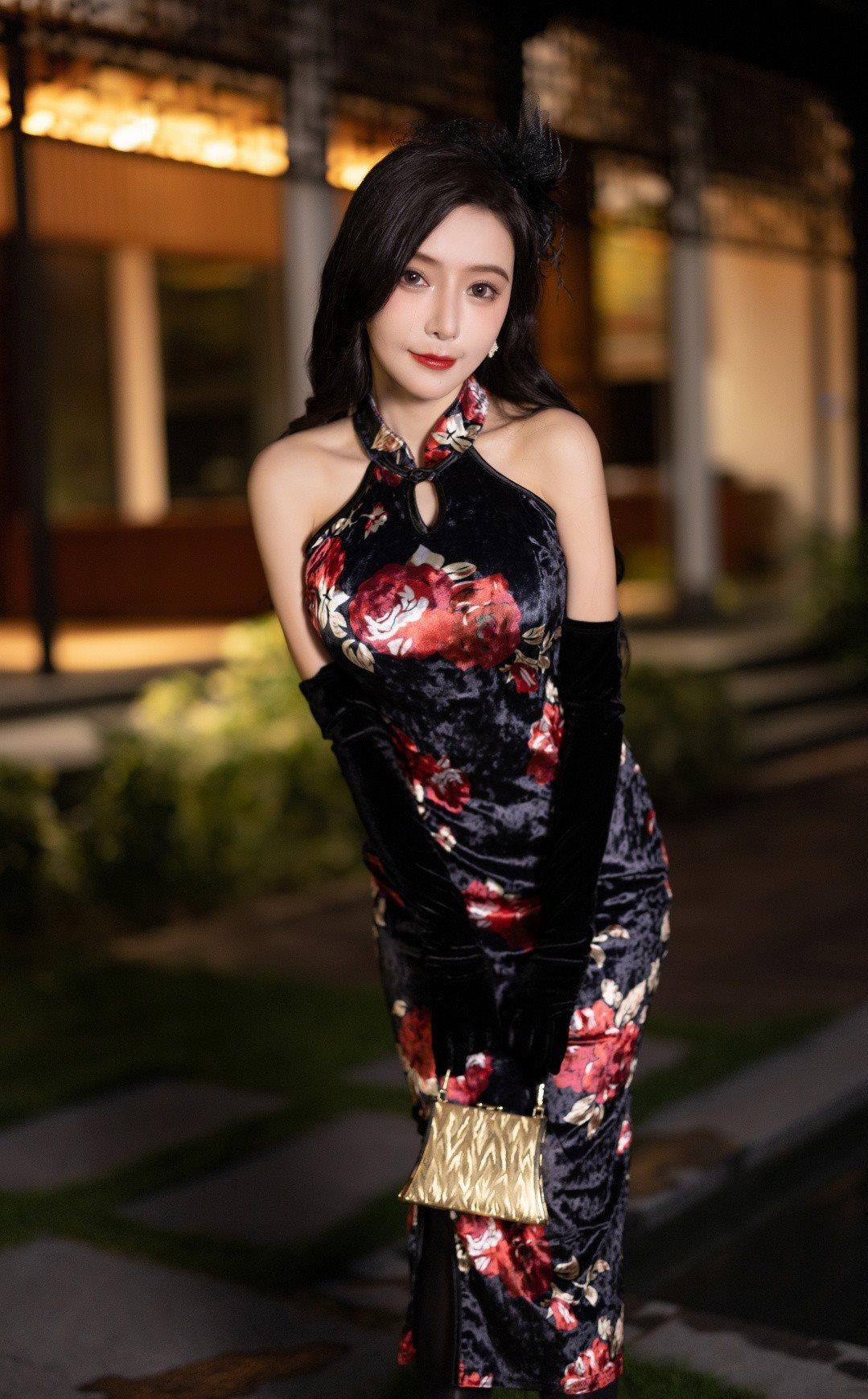 暗黑印花的改良版旗袍连衣裙配上黑色丝袜高跟鞋时尚奢华又性感