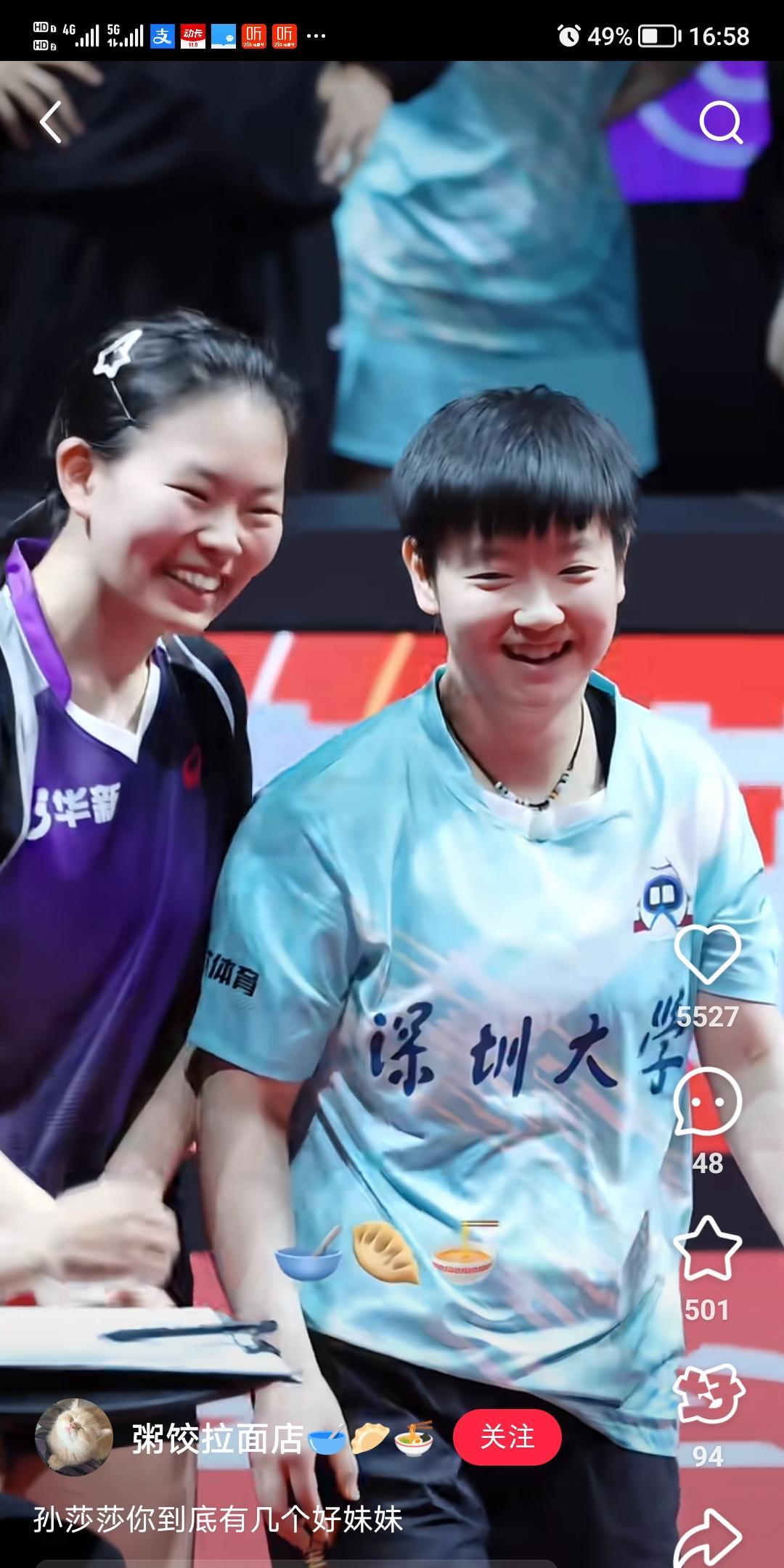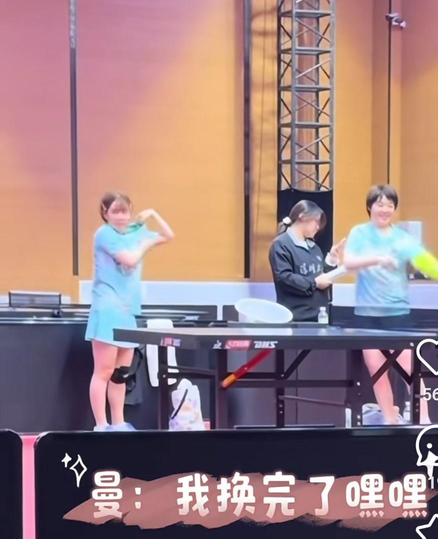 平野跟着小曼姐学换衣服。 蒯曼又在训练馆里换衣服了,这换的很丝滑啊,平野美宇看到蒯曼这样换衣服,她也学着小曼姐换衣服,深大幼儿园的小朋友们在一起真的很快乐呢,看到覃予萱在练球了。 今天是乒超第三阶段的第二个比赛日,深圳大学是取得二连胜,今天上午深大3-2赢了黄石基地,最后一个下班。莎莎比赛结束后,找不到自己的衣服了,后来深大教练把衣服拿过来让莎莎闻一下,莎莎一闻就知道是自己的衣服,这是闻香识衣服了。 还是打乒超氛围好,莎莎打到最后一场,球迷们也一直陪着她。赛后采访莎莎说觉得新疆的大盘鸡还不错,她说和姚睿轩也是比较熟悉,经常在一起训练,莎莎比赛结束后还指导一下姚睿轩,她对妹妹真好。明天的比赛,莎莎继续加油哦!