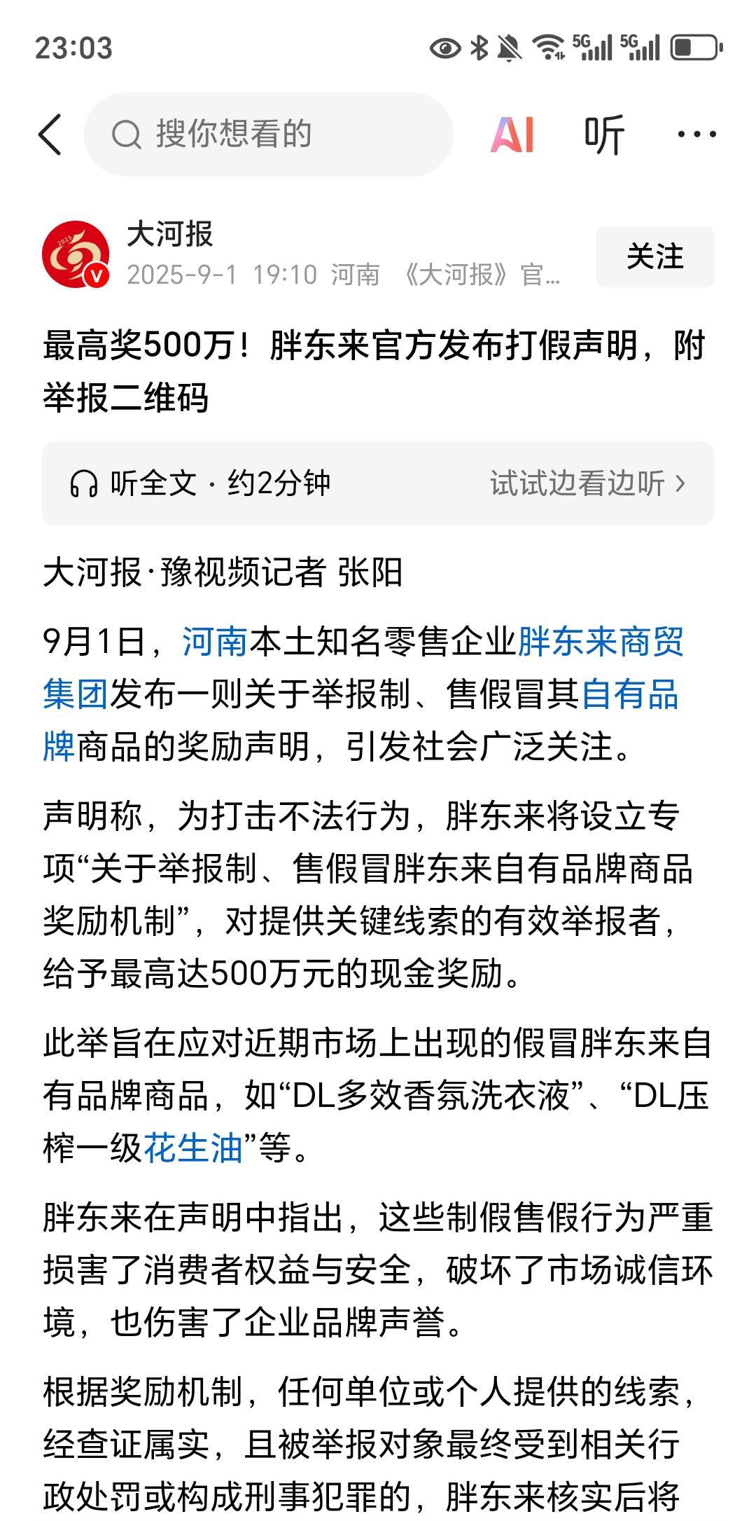 有意思了!近日有网友举报,永辉卖的燕麦脆没有生产日期。这款在永辉买到的产品,上面写的是由胖东来委托制造的。 永辉看到这个信息后,第一时间下架了该产品。并且向记者表示,已经对该产品进行了核查。 就在刚刚我又看了,胖东来刚发布的一个信息。最近市面上出现了,大量制假售假胖东来自有商品的情况。他们开出了500万加码,奖励举报者。 希望这两件事,没有任何关系。也希望永辉这边卖的出问题的东西,是供货商那边的失误。不然的话,就会很搞笑。另外说一句,举报人说的那款没有生产日期的商品。别的人买的,上面是有生产日期的。