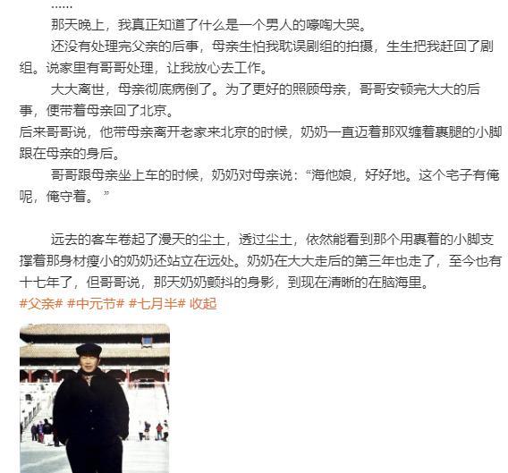 突然发现,原来郭晓东才是娱乐圈里那个最特别的存在,主要有两点。 一是当别的艺人都在靠拍照片或视频来记录生活,并维持自己热度的时候,郭晓东却坚持用文字分享他的心情,这在明星里面已经很少见,毕竟照片可以让身边人拍,视频也可以让工作人员剪辑,唯有表达真实情感的那些字一定要自己写出来才有意义。看了今天“七月半”郭晓东怀念他“大大”的长作文,我泪目了,亲人的离去从来不是一场暴雨,而是一生的潮湿。 二是郭晓东真的就是草根演员,一步一个脚印从大山里走出来,没有背景没有奇迹。