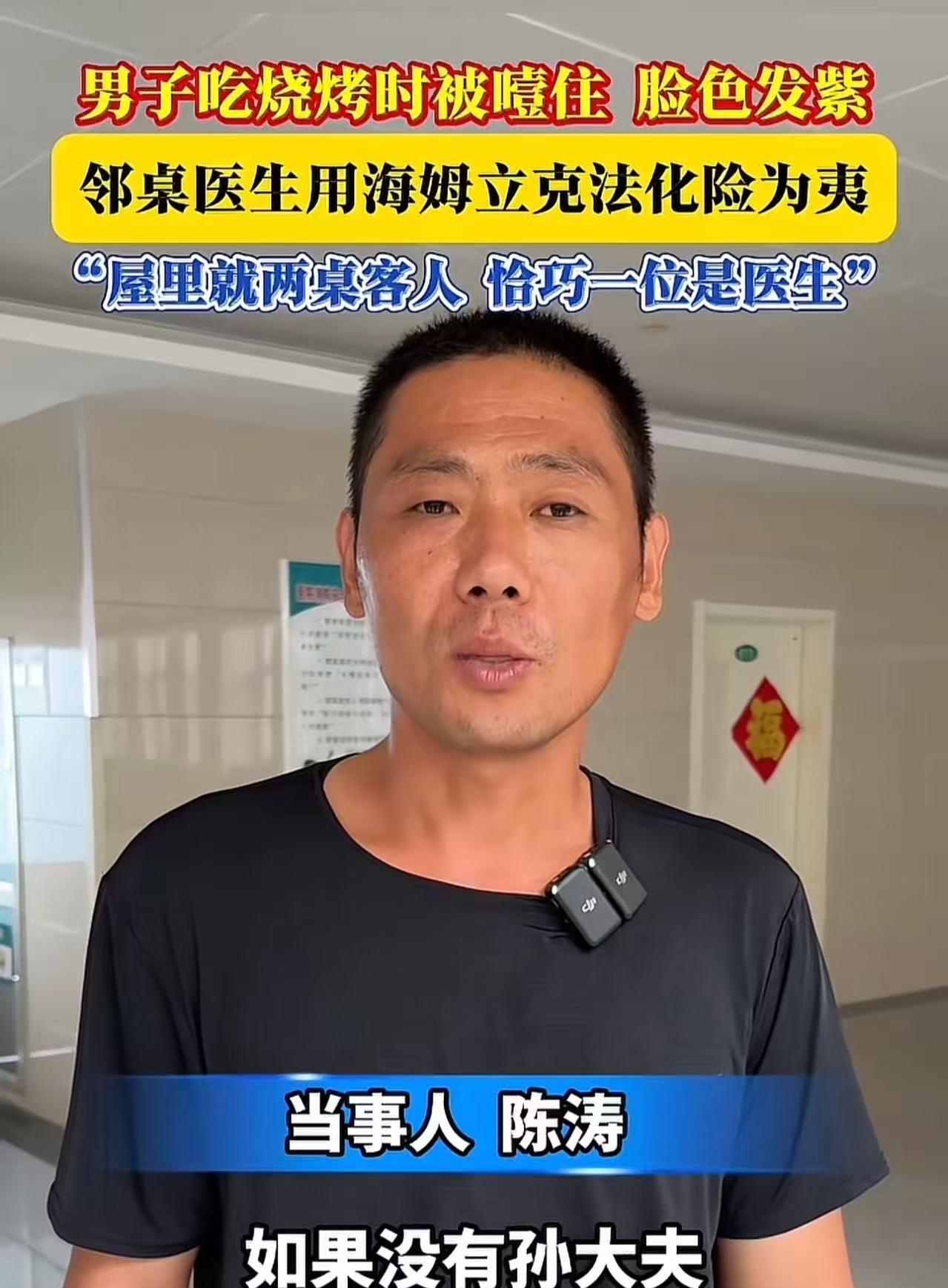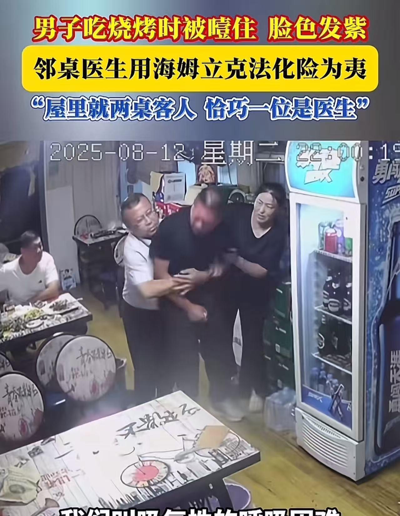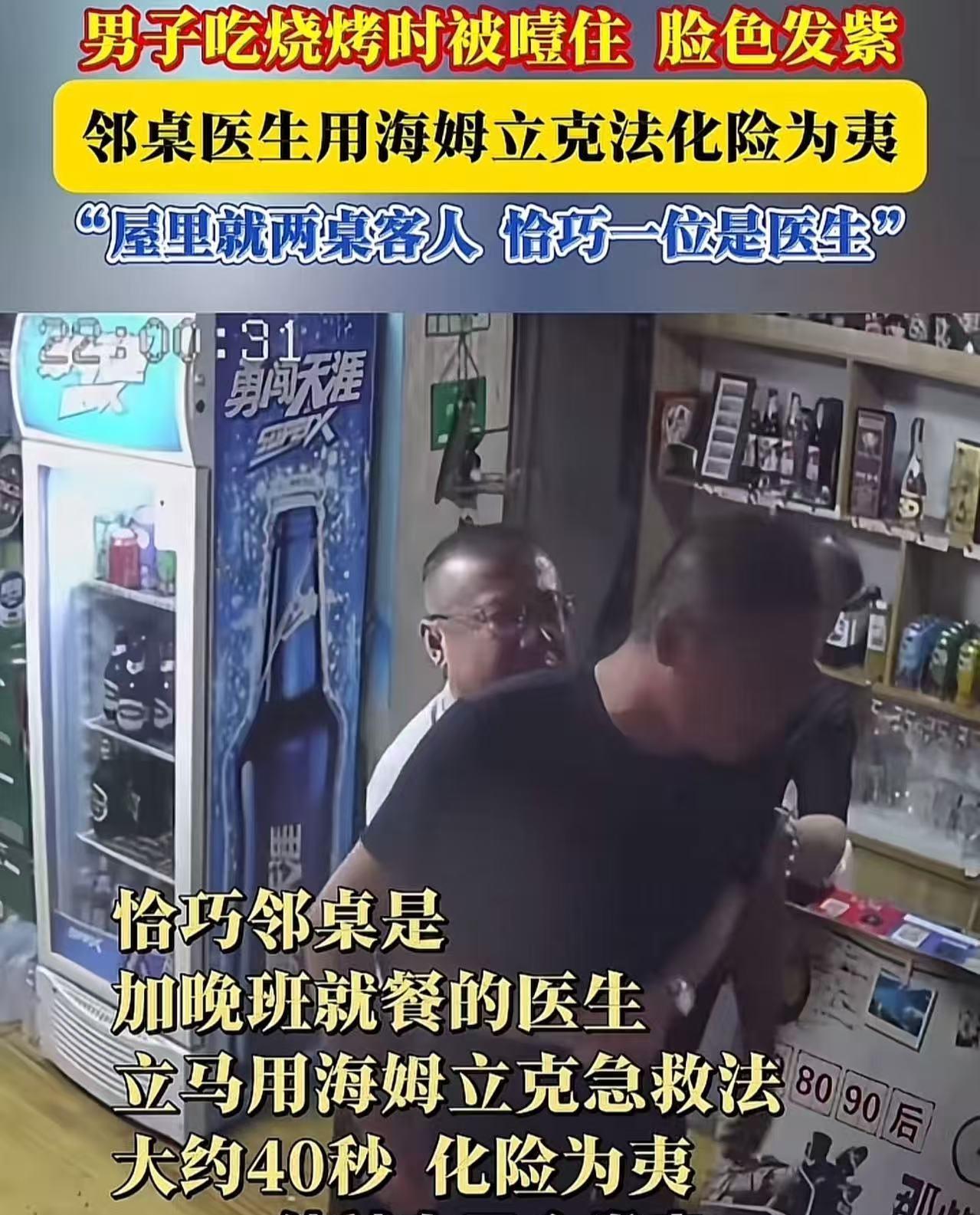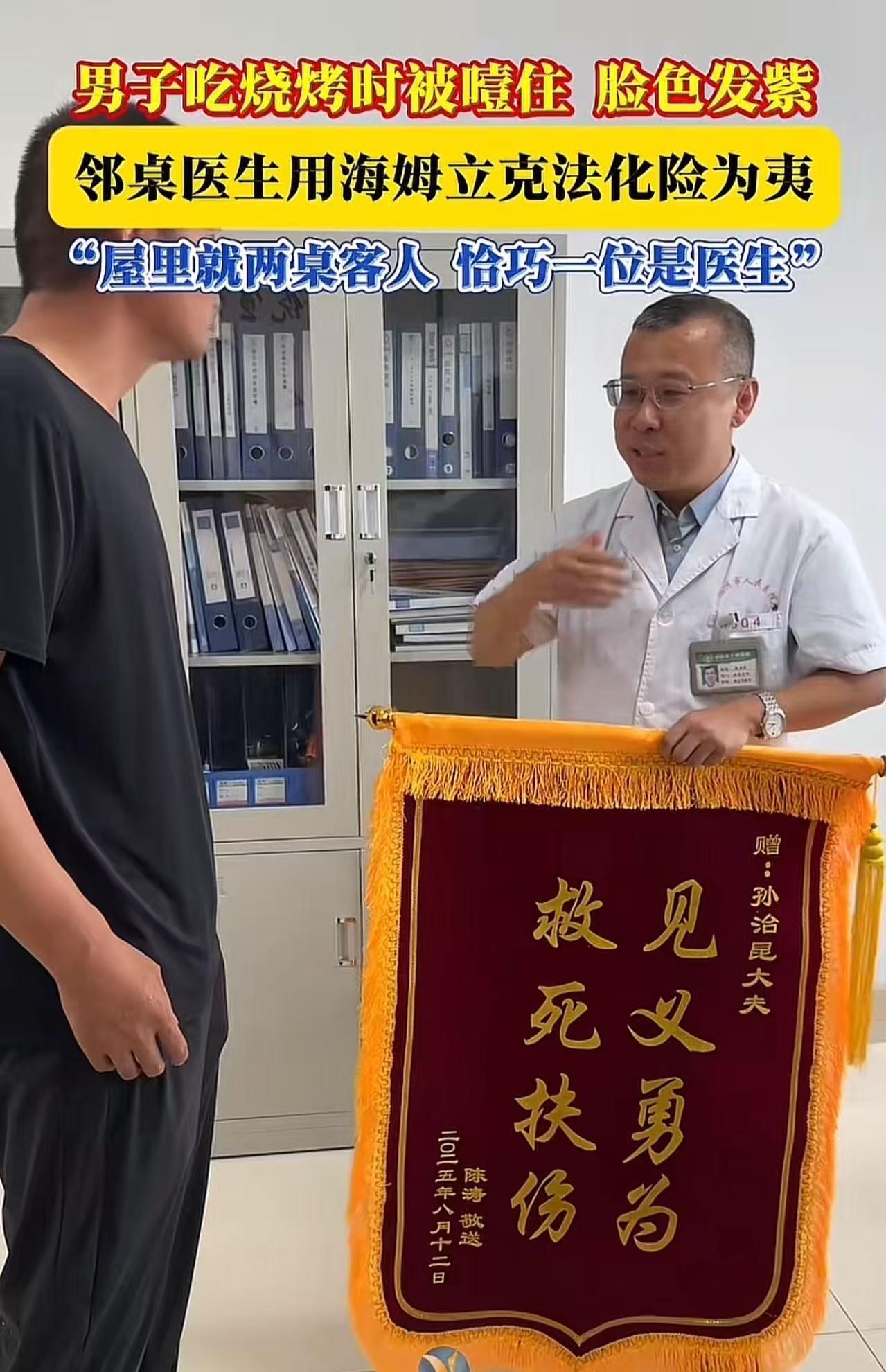 “这就是命啊!”山东招远,男子在夜宵店吃饭时,不慎被大饼噎住,脸色发紫,呼吸不上来。而当时店里就两桌客人,恰巧有一位是医生,他用海姆立克法救了男子一条命!男子:“要是没有他,我就没命了!他就像上天派来救我的!” (来源:招远融媒) 这天,男子下班时间比往常晚了一些,饥肠辘辘的他独自走进夜宵店,打算吃点东西填填肚子。 他点了一份热气腾腾的饼,那饼散发着诱人的香气,刚咬上一口,他就觉得味道美极了,于是顾不上细细咀嚼,便狼吞虎咽起来。 可没想到,这一大口饼下去,竟然卡在了喉咙里。男子难受极了。他本能地尝试把饼咽下去,用力地往下咽,可那饼就像一块顽固的石头,纹丝不动。 渐渐地,他开始觉得呼吸变得困难,整个人慌了神,从座位上站起来寻求帮助。 店里的老板娘眼尖,一下子就注意到了男子的异常。她赶忙跑过去,轻轻怕打男子的背部,希望能帮他缓解一下。 可拍了几下,依然没有任何效果,男子的脸色越来越差,呼吸也越来越急促。 幸运的是,市人民医院门诊部副主任孙医生正好坐在隔壁桌吃夜宵。他看到男子双手紧紧地掐着脖子,脸涨得通红,却说不出一句话,喉咙里只能发出“吼吼”的艰难声音,很明显是出现了呼气性的呼吸困难。 孙医生凭借着丰富的临床经验,立刻判断出男子是被异物卡住了喉咙。他毫不犹豫地站起身来,快步走到男子身边,从背后搂住男子,熟练地运用海姆立克急救法,对着男子的腹部进行有节奏的冲击。 一下、两下、三下……大约过了40秒,男子突然发出一阵剧烈的咳嗽,紧接着,卡在喉咙里的异物被吐了出来。 男子这才长长地舒了一口气,呼吸也恢复了正常。 事后,男子特意定制了一面锦旗,送到孙医生手中。他感激地说:“当时店里就我们三个客人,孙医生刚好是医生!,我真是太幸运了,如果没有孙大夫凭借他专业的知识和娴熟的手法及时出手相助,我这条命可能就没了!” 孙医生,在他人生命危在旦夕之时,毫不犹豫地伸出援手!他的善举,不仅挽救了一个生命,更让我们看到了人性的光辉和医者的担当! 还有心肺复苏和海姆立克急救法,建议大家都网上学学吧,挺简单的,黄金四分钟有时候等不到救护车的!