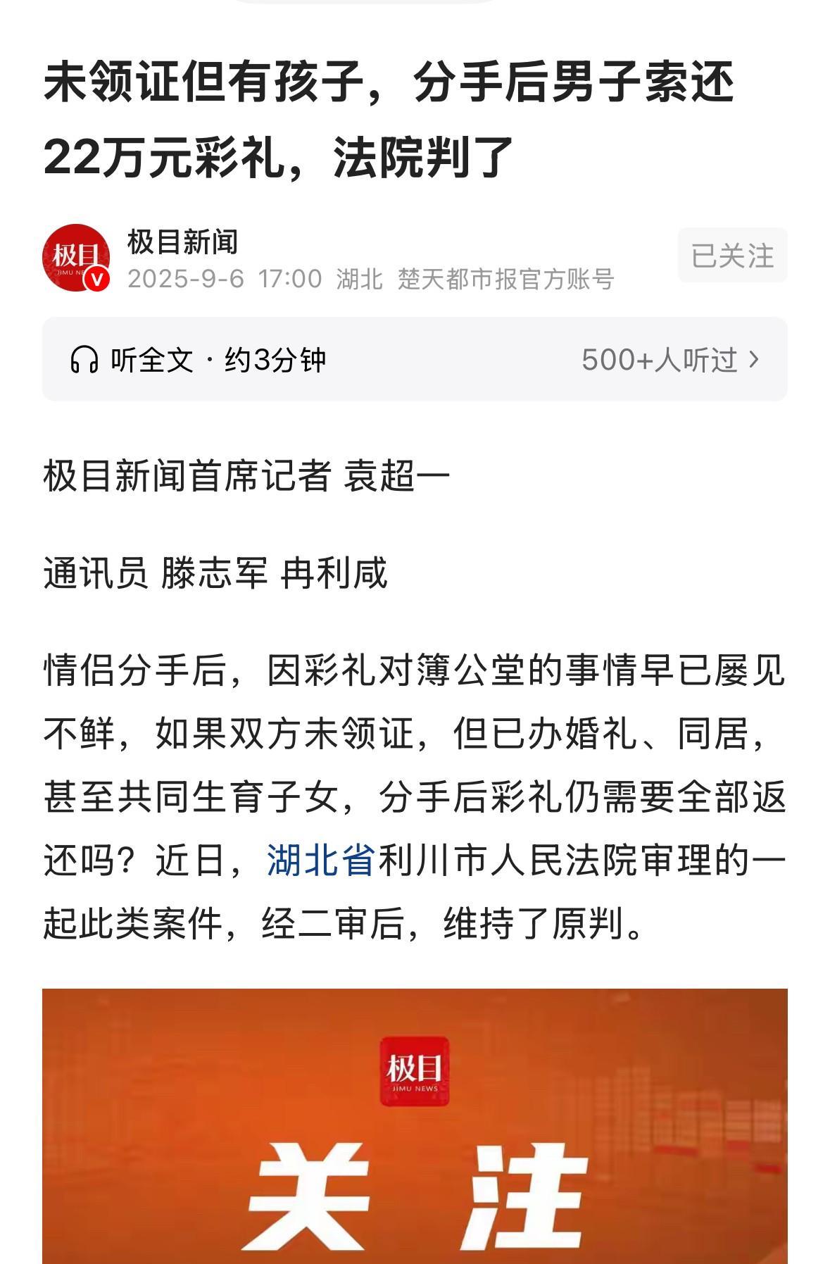 湖北利川,男女双方在没有领证的前提下举办婚礼并同居生活,女方怀孕后两个人就开始因两地务工而分居,后因琐事争吵不休闹到分手,女方搬回娘家住,随后生下女儿。不久后女方起诉争夺抚养权并胜诉,男方每月给付1500元抚养费。随后男方就把女方起诉到了法院,要求返还22万彩礼,法院这样判决。 小曾常年在外务工,一直也没有谈对象,家里很是着急,于是经常找人帮忙介绍。 在2022年的时候,经人介绍,小曾认识了小红。小曾跟小红短暂相处后觉得对方还不错,就以结婚为目的开始了谈恋爱。 恋爱谈的差不多后,小曾觉得可以考虑结婚的事情了,就跟小红商量,在2023年1月要去小红家看人户。 按照小曾家乡的农村习俗,在给礼金前需要到女方家里考察一下家庭条件,然后才好确定礼金的多少,以及商议后续彩礼的具体金额。 小曾一家人带着媒人一起来到小红家看人户,小曾对小红家还算是满意,于是通过媒人交付了6万元的礼金。 交完礼金后,这桩婚事就算是订了下来,于是小曾和小红两家人就开始着手操办两个人的婚礼。 在2023年9月,小曾跟小红拍摄了婚纱照,在次年2月,按照农村风俗举行了婚礼。 婚礼当天,小曾按照之前的承诺给付了13万元的现金,其中10万元是彩礼钱,剩下3万元是女方家举行婚礼的物资折现。 婚礼后小红就搬到小曾家开始同居,不久后小红就怀上了孩子。 小红的怀孕让小曾不得不加把劲挣钱养家,于是在得知小红怀孕的消息后,前往安徽务工。小红也不是娇气的女孩子,虽然怀有身孕,但也去了外省务工。 刚结婚不久两个人就分居两地,好多矛盾就爆发出来了。因为一些琐事,小曾跟小红就能吵的不可开交,久而久之吵得频繁了,两个人就闹到分手。 既然分手了,小红就从小曾的家里搬回了娘家住,正好孩子也快出生了,回娘家也好有个照应。 搬回去不久,小红就生下一个女儿。因为小曾跟小红已经分手,那么对于孩子的抚养权问题总要有个说法,小曾应该负起一个父亲该有的责任! 但是小曾并没有打算负责的意思,于是小红就将小曾起诉到了法院,女儿的抚养权以及抚养费问题一定要有个说法。 根据《民法典》第1085条的规定:离婚后,子女由一方直接抚养的,另一方应当负担部分或者全部抚养费。负担费用的多少和期限的长短,由双方协议;协议不成的,由人民法院判决。 孩子还不满2周岁,原则上应由母亲直接抚养。而小曾作为孩子的父亲,应该承担起支付抚养费用的义务。 法院经过审理后做出判决,女儿由小红抚养并跟随其生活,小曾需每个月支付1500元的抚养费。 小红胜诉后,小曾家里不干了,认为孩子归小红抚养,小曾家什么都没有得到,于是也起诉到了法院,要求小红以及家人返还22万彩礼。 小红家从看人户那天直到婚礼,一共就收到16万的彩礼,虽然小曾家给了19万,但是其中3万是为了对小红家举行酒席的物资折现,不能算是彩礼。 如今小曾家起诉返还22万彩礼,小红家觉得很莫名其妙,剩下的3万元是哪里来的? 小曾起诉小红家归还的彩礼22万元,分别包括看人户和过礼以及三金的19万元,还有各种红包、改口费、打发钱、拍婚纱照及购物等支出,共计是22万元。 根据《最高法关于审理涉彩礼纠纷案件适用法律若干问题的规定》第3条的规定:人民法院在审理涉彩礼纠纷案件中,可以根据一方给付财物的目的,综合考虑双方当地习俗、给付的时间和方式、财物价值、给付人及接收人等事实,认定彩礼范围。 法院审理后认为,小曾家给付的6万礼金,以及婚礼当天给付的13万现金,可以认定为彩礼。 至于其他的费用支出,属于增进感情的消费性支出以及礼尚往来的行为支出,属于赠与性质,不能认定为彩礼。 根据《最高人民法院关于适用<民法典>婚姻家庭编的解释(一)》第5条的规定: 当事人请求返还按照习俗给付的彩礼的,如果查明属于以下情形,人民法院应当予以支持: (一)双方未办理结婚登记手续; (二)双方办理结婚登记手续但确未共同生活; (三)婚前给付并导致给付人生活困难。 小曾与小红虽然举办了婚礼并同居生子,但并未办理结婚登记手续,所以符合返还彩礼的情形。 虽然小曾被判需每月支付抚养费用,但是小红一个人抚养孩子长大成人付出的精力和经济成本更高。