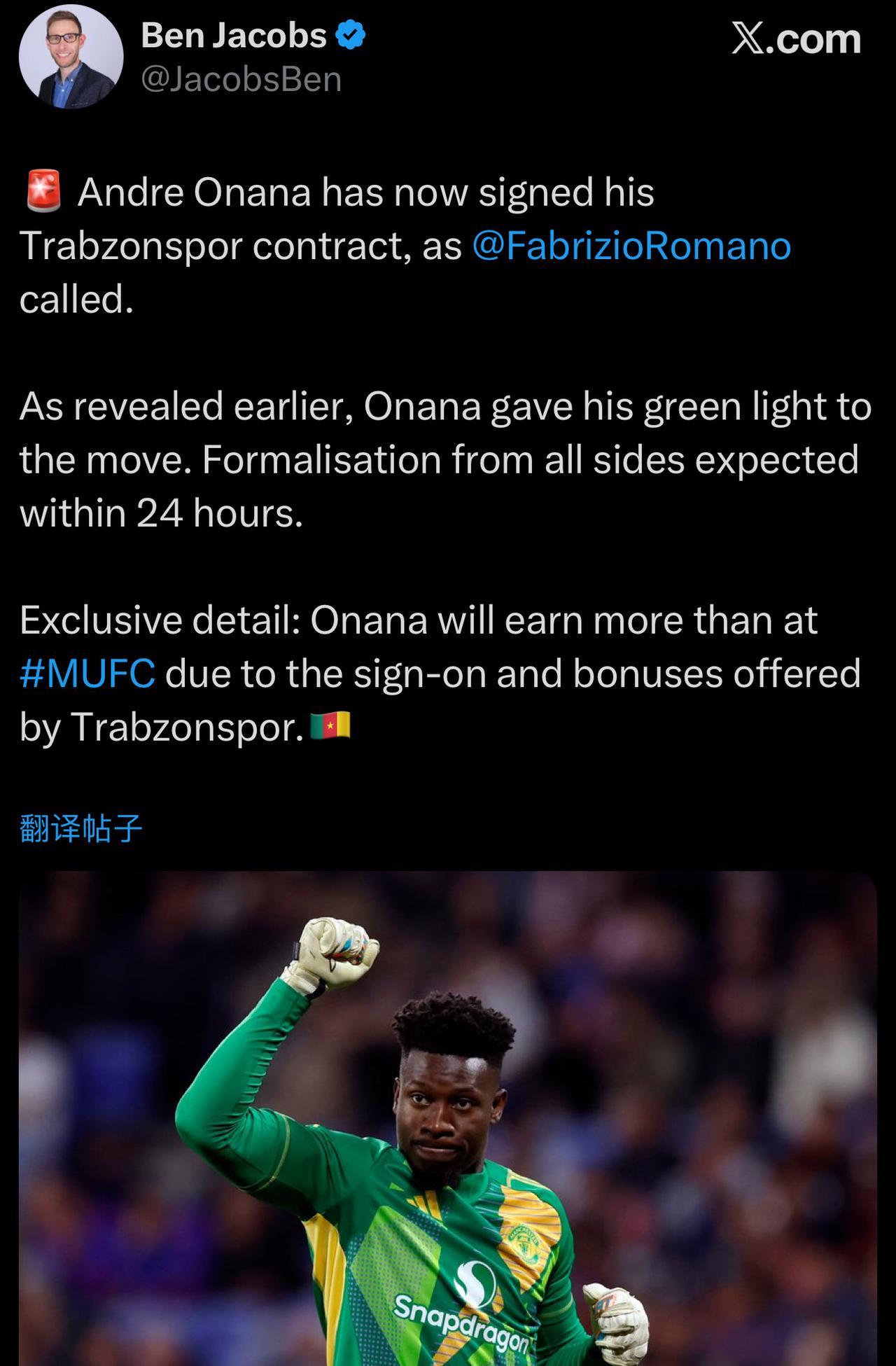 独家消息:由于特拉布宗体育提供的签约金和奖金,奥纳纳的收入将超过曼联。 (我强烈