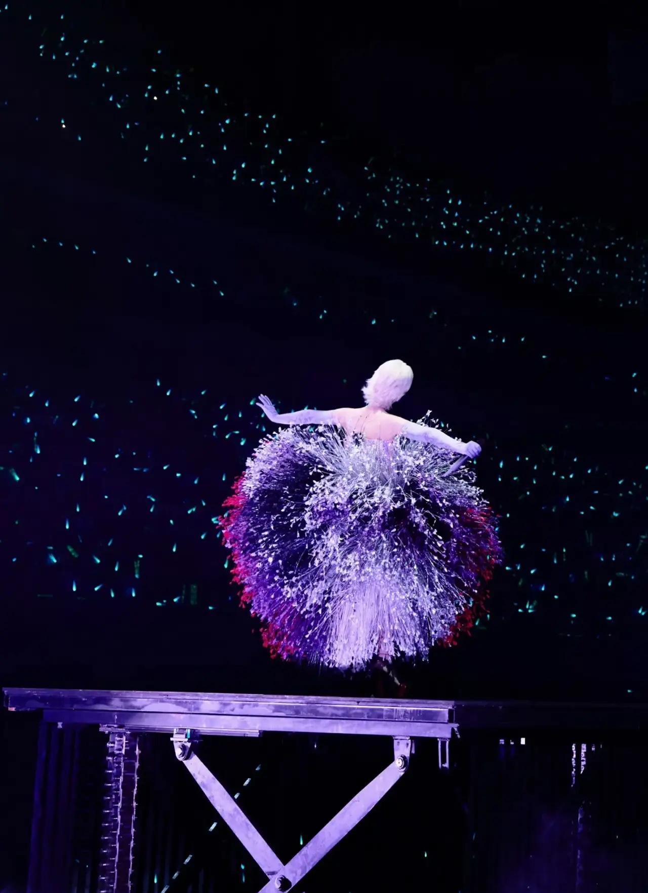 周笔畅这次上海演唱会简直杀疯了!9月6号在东方体育中心,她一出场直接把观众看傻——穿得像个会发光的“钢丝球”,手上套着银闪闪的“洗碗手套”,这造型前卫得能直接搬去巴黎时装周!金属丝线编织的裙摆红紫银三色流转,配上舞台激光直接炸成烟花海,网友直呼“银河女神降临”。[比心] 仔细一扒才知道,这套高定出自伦敦设计师Robert Wun之手,灵感来自雨滴凝结的瞬间,全球首穿就被她拿下了。更绝的是手套细节:镜面材质反射出千万个小光点,和裙摆的金属光泽呼应,像把整个宇宙穿在了身上。现场视频里她边唱《隔墙花》边甩袖,裙摆炸开的光影比特效还震撼,台下粉丝举着“满脸帅气”灯牌疯狂尖叫。[点亮平安灯][比心]