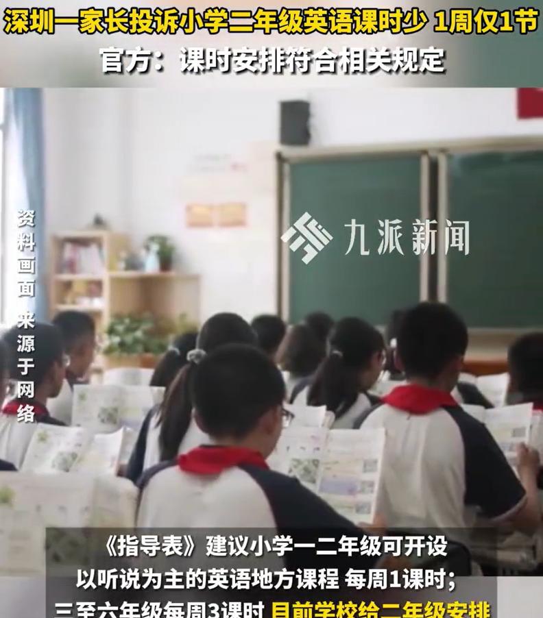 “小学二年级,英语课一周就一节?这真的够吗?”广东深圳,一家长在网上吐槽,他的孩子正在上小学二年级,每天课程排得满满当当,但仔细一看,英语课每周只有一节。相比之下,语文每周有7节,就连同年级的其他学校,英语也普遍安排3节,更不用说三四年级每周都有4节英语课 这位家长还提到,学校不让孩子带英语的随堂练习册进校,也没有配套的课堂练习。用他的话说,这有点像“把学校该做的事推给了家长”,孩子在校练得少,回家如果家长不抓,英语很容易掉队 对此,官方回应。英语确实是从小学三年级才正式开始开设。但龙岗区在制定本地课程计划时,也考虑到了一二年级的需求,因此专门设计了以“听和说”为主的英语口语课,每周1节,三到六年级则每周3节,所以没有问题 有网友认为:家长太奇葩了,把英语课看得那么重要可以送去国外 其实这个说法有些片面了,家长重视英语,并不等于认为它“最重要”,更不等于想送孩子出国。事实上,很多家长让孩子学英语,目的非常实际:就是为了跟上学校的教学节奏,避免孩子从小掉队 目前英语仍是三大主科之一。中高考要考,升学要看分数,这是一个现实。而且现在和以后的年轻人出国的机会很多,不说出去工作啥的,就出去旅个游吧,多懂一门外语有啥不好的