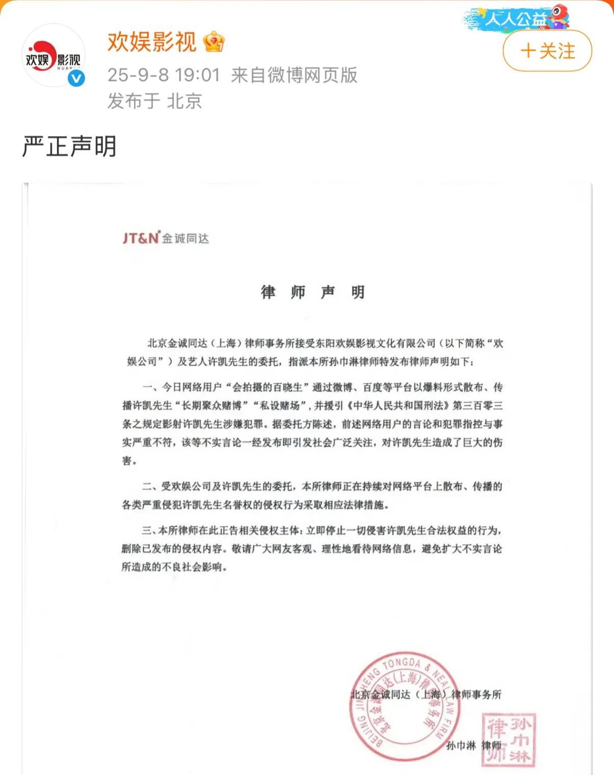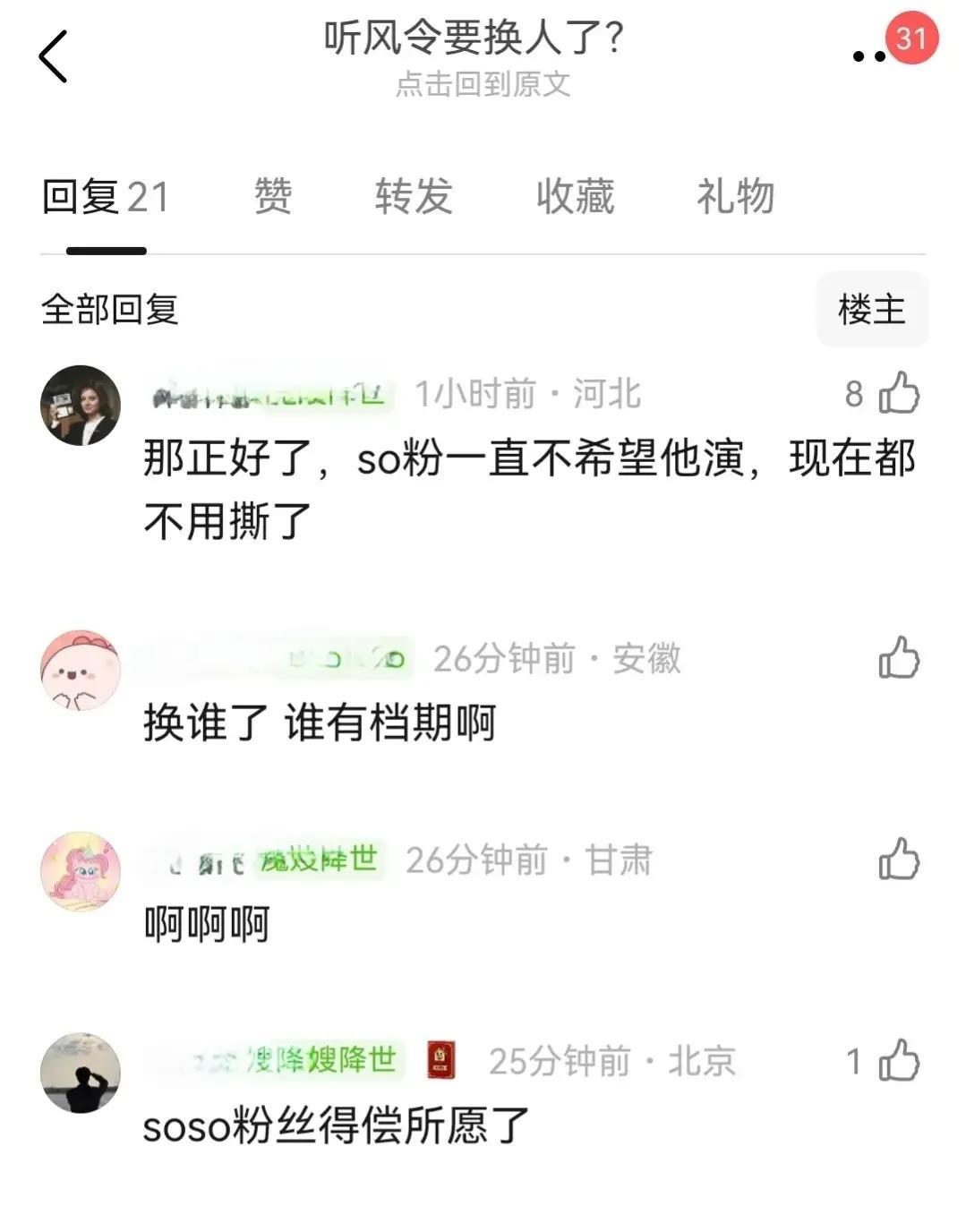 虽然许凯方否认了赌.博一事,但是业内制片人还是锤了许凯的下一部戏被换角了。 9月8日晚,制片人陈益韬发文,称许凯下一部男主24号开机前被换,还艾特许荔莎:“妹妹差不多就行了你不怕,后面三部待播剧的资方们都瑟瑟发抖。”陈益韬还表示自己被于正拉.黑,所以多说几句也不怕得罪他。 原本《听风令》定了许凯和魏哲鸣作为双男主出演。许凯粉丝一直在极力的抵制,她们觉得许凯的咖位高于魏哲鸣,如果同番是在给魏哲鸣抬轿。