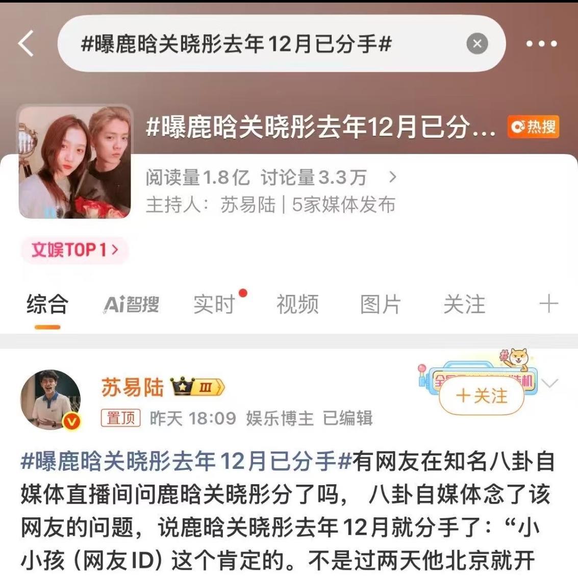 到现在还有人在苦苦挣扎,非说关晓彤和鹿晗还没有分手吗? 本来我也是这样认为的,但是最近的马脚露的太多,基本可以判断他们已经分手了。 1、最近关晓彤参加节目,她在节目里说了,去年一年的时间都在“如果让大雨一直落下”。应该就是去年分手那段时间了,关晓彤是通过音乐疗伤吧。 3、鹿晗是一个很有边界感的人,今年演唱会他开始叫粉丝“老婆”了。这个实在太明显了,不分手的话,不可能会叫的。 4、鹿晗事业心不重,自他官宣恋情以来,这么多年也没什么作品。今年突然大肆开演唱会。很明显是感情受伤,把注意力转移到事业上面来了。 5、有网友问知名八卦自媒体鹿晗和关晓彤分手没有,八卦自媒体爆料说已经分了,大概是去年12月份的时候。 从以上5点来看,基本断定他们已经分手了。 可是不知道他们为什么都不肯正面回应呢?一直让大家猜猜猜。#关晓彤# #鹿晗关晓彤#