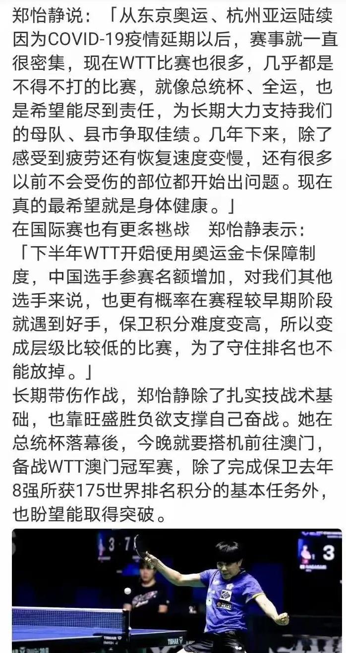 郑怡静退赛王曼昱直接晋级了。澳门冠军赛开打前郑怡静就对奥运金卡保障制提出来质疑。 看吧!网络里没有一丝风是空穴来风。巴黎奥运会前的五月樊振东的最后一舞。郑怡静澳门冠军赛前的质疑。都证明了任何事都有先兆。 郑怡静的退赛恰恰说明了运动员是人不是神,不是机器。就像樊振东打德甲打一场歇几天一样。而且还不用考虑胜负和积分,都是对自身身体的保护。 其实WTT是个非常好的国际赛事,它把世界各地的球员有效的组织起来比赛,但是它仍然有些方面还需改进。奥运金卡保障制对于那些普通球员来说不用质疑,确实就是特权,仍然是不合理的。被质疑是早晚的事。后续还应有更合理的改革和创新。