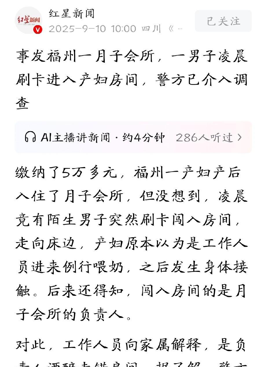 福建福州,女子生完孩子,花5万块钱住进一家月子会所。本想着好好坐个月子,谁知,凌晨时分,竟有人突然刷卡闯入房间,还径直走向她床边,跟她发生了肢体接触。女子原本以为是工作人员进来例行喂奶,仔细一瞧,竟是个陌生男子。女子吓得尖叫,对方这才仓皇而逃。事后,女子查看监控,竟发现该男子是月子会所的负责人。会所管理严格,进出房间都要刷卡,负责人究竟是如何进来的?会所给出的解释让人气不打一处来。 小王临近生产时,为了能舒舒服服地坐个月子,还有专业人士好好照顾宝宝,她打算住月子中心。 她左挑右选,看了好多家月子会所,最后选中了一家,看着环境挺好,但价格也不便宜,要5万多块钱。 8月14日,小王正式入住这家月子会所。 刚开始那几天,一切都还算正常,每天凌晨1点左右,会所员工都会准时刷卡进入房间,提醒产妇为宝宝喂奶,让她省了不少心。 9月1日凌晨一点半左右,小王睡得迷迷糊糊,突然听到房门刷卡的声音。 一开始,她以为是员工来叫她喂奶,就没太在意,可等了几秒,她却没有听见员工惯常的提示语。 还没等她反应过来,一名男子便推开了虚掩的卧室门,在黑暗中径直走向床边,俯身靠近。 一个黑影朝自己压过来,紧接着就发生了身体接触。 她妈妈当时在她旁边睡得也浅,看到那个男人后,母女俩立刻尖叫起来,那男人听到叫声,这才仓皇而逃。 小王惊魂未定,又气又怕,大半夜怎么会有男人大半夜闯进房间,这个人究竟是谁? 为了搞清真相,她第一时间联系了会所员工,员工在电话里说会在了解情况后给她反馈。 可小王等了一整晚,没收到任何解释。她越想越不对劲,觉得这事儿肯定没那么简单。 9月1日早上7点,小王实在等不下去了,选择了报警。 民警抵达现场后,叫来了会所负责人王某,令她们吃惊的是,调取监控视频后确认,凌晨刷卡进入房间的不是别人,正是这个王某。 小王和母亲满心委屈和愤怒,花了这么多钱,就是图个安心,没想到却遇到这样的事。 他们住进来这么久,从没见过这个负责人,平时连男性员工都没见过,怎么还能深夜随意进入产妇房间,太过分了。 而且,这个会所管理比较严格,从一楼乘坐电梯至七楼需刷卡,进入七楼区域仍需二次刷卡,进入客户房间则需第三次刷卡,走出月子会所也必须刷卡。 那么,他到底是怎么进入房间的? 对此,会所员工表示,8月31日晚上,他们会所举办了七周年庆祝活动,负责人王某喝醉了,之后被几名员工送到了702房间休息,是不小心走错了。 但是,从702房间到小王住的713房间,至少有40余米,要过两个拐角口,就算他喝的人事不省,怎么能走错这么远,这解释也太牵强了。 让小王没想到的是,没过多久,员工们又突然改口,称并不认识监控视频里的王某。 这突如其来的转变让小王和家属气不打一处来,这掩耳盗铃的表现,实在太不负责了。 从法律角度,应该如何看待此事呢? 根据《民法典》第1032条规定:自然人享有隐私权,任何组织或者个人不得以刺探、侵扰、泄露、公开等方式侵害他人的隐私权。 王某在未经小王同意的情况下,深夜刷卡进入其房间,该行为侵扰了小王的私人生活安宁,侵犯了她的隐私权。 此外,小王与月子中心之间形成了服务合同关系,月子中心有义务按照约定提供安全、舒适的服务环境。 根据《民法典》第509条规定:当事人应当按照约定全面履行自己的义务,遵循诚信原则,根据合同的性质、目的和交易习惯履行通知、协助、保密等义务。 月子中心未能有效管理其员工,导致负责人王某进入小王房间,违反了合同约定的安全保障义务和保密义务,构成违约。 小王可以要求月子中心承担违约责任,如赔偿损失等。 而且,王某是在醉酒状态下闯入小王房间,其行为可能构成侵犯他人人身权利,公安机关可根据《治安管理处罚法》的相关规定,对其进行处罚。 小王对这家月子中心彻底失望,9月1日下午,搬离该月子会所。 目前,公安部门已介入调查。 关注@亚伟说法 ,多学法律,少走弯路!