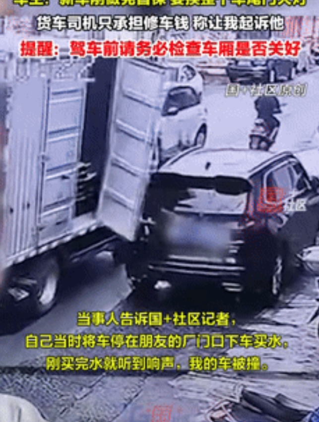 “冤吗?”广东阳江,一车主把车停到朋友厂门口后,就下车买水,不料,刚买完水就听到一阵巨响,他的车被辆没有关好车厢门的货车撞了,车尾灯和大灯均受损,货车司机见状只愿意赔偿修车钱,可车主还要折旧费和误工费,货车司机果断拒绝,并让车主起诉他,网友:车主停的地方对吗? 据国+社区9月10日消息,车主本来还在慢悠悠的走,看到爱车的惨状后,顿时没了喝水的心情,他提车没多长时间,就碰到这样的事,真是倒了大霉了。 货车司机急忙踩刹车,他迅速赶到车主身边,科目三考的绕车一圈全给忘了,这个过程最简单,也是最容易被人忽视的一点,司机再后悔也没用,他没检查是他的错。 所以维修费不用车主开口,他自然会承担,但车主要的不仅仅是这点钱,原本内疚的司机顿时换上疑惑的表情,听完对方说的话后,司机万万没法接受。 难道没买车前,车主都是不上班的吗,怎么还扯到误工费了,至于其他钱,司机不能苟同,要是车主认定这钱就该他拿,可以走诉讼途径,他按照结果办事。 司机不幸的同时又是幸运的,他碰的是车,要是骑行的人,后果非常严重,可见上车前看车况有多重要。 不过车主没在停车位里,即便是临时停车也得按规矩办事,毕竟有些地方是不允许停的,要是真的要起诉,他的个人因素估计也要考虑进去。 对于这件事情,大家有什么看法? 信息来源:国+社区 2025年9月10日