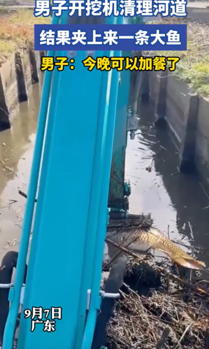 “解释不清了!”广东,男子开挖机清理河道,不料,才挖到一半,就挖到了一条“大鲤鱼”!看这个样子,估计这条鲤鱼至少15斤以上,男子直呼,今晚可以加餐了!网友:水太脏,鱼不干净,干脆给我吧! 挖掘机的铲斗缓缓沉入浑浊的河道中,伴随着发动机的轰鸣声,淤泥被一点点搅动起来,这是广东某地河道清理工程的普通一天,操作挖掘机的师傅像往常一样专注地工作着。 突然铲斗在提升过程中带起了一个异常沉重的物体,泥水哗啦啦地从缝隙中流下,露出一个活蹦乱跳的身影——那是一条体型硕大的鲤鱼,在铲斗里拼命扑腾,鳞片在阳光下闪着银光。 男子停下了操作,跳下驾驶室凑近查看,这条鱼的体型确实惊人,目测长度超过半米,鱼鳍有力地摆动着,尾巴拍打在铲斗壁上发出沉闷的响声,他忍不住笑出声来,随手掏出手机拍下了这意外收获的视频。 视频中他一边展示着这条“意外之喜”,一边调侃道:“今晚可以加餐了!”鱼儿在铲斗里挣扎的力度让铲斗都微微晃动,个头几乎占了半个铲斗的空间。 这段视频很快在网络上传播开来,引发了网友们的热烈讨论,有人羡慕男子的好运气,也有人提出了不同的看法,一位网友留言说:“水这么脏,鱼肯定不干净,还是放生吧,或者干脆给我!” 另一位网友则表示:“清理河道挖到鱼说明生态环境在改善,虽然河水看着浑浊,但能有这么大的鱼生存也是好事。” 河道淤泥中生存的大型鱼类并不罕见,鲤鱼作为适应性很强的淡水鱼,能够在各种水质环境中生存,它们以水生植物、藻类和底栖生物为食,在淤泥较多的水域反而能找到丰富的食物来源,这条15斤重的鲤鱼显然已经在此生长多年,才能达到如此体型。 这个发生在广东河道边的小插曲,就像一面镜子,映照出人与自然关系的多个层面,它既是一个关于意外收获的轻松故事,也是一个引发思考的环境议题,当挖掘机的铲斗挖出那条大鲤鱼时,挖出的不仅是一顿美餐的可能,更是关于生态、环境与人类活动如何共存的深刻话题。 对此你怎么看?欢迎大家在评论区留言讨论。