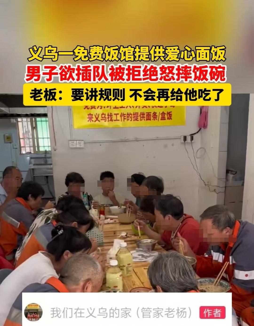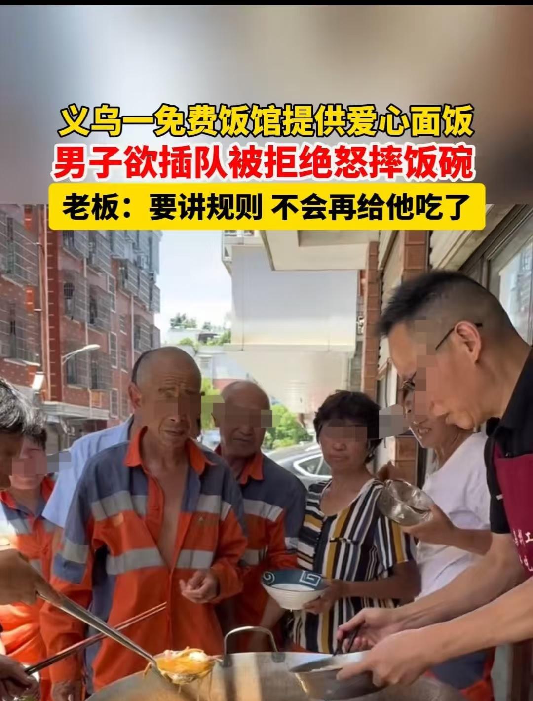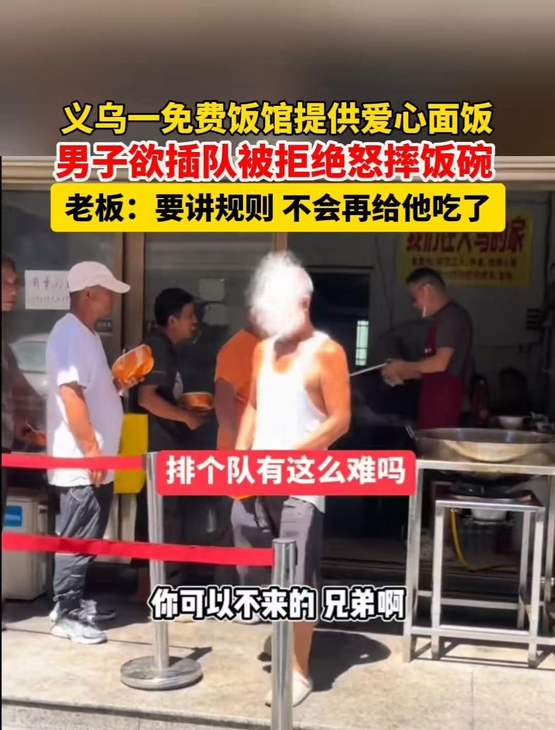 浙江,老板给大家提供免费的盒饭,他让大家排好队,不能插队。结果,一名中年男子不听,硬是插到了队伍的最前面。老板不给他打餐,他就呆在那里不走。老板接过后面人的碗,为别人打了餐,男子就把盒饭重重地摔到过道,头也不回地走了。老板不生气,只是大声地告诉他:“以后也不要来了,来了也不会给你,性质都变了。” 搜狐网9月10日报道,张老板在义乌开了一家免费的餐厅,专门为外卖小哥、快递小哥、环卫工人,还有来当地找工作的困难人士提供帮助。 只要一到饭点,张老板就拿出几个安全警示桩,再把红布条一拉,让来的顾客都按照前后顺序排好队,并叮嘱大家不要插队。 他觉得自己虽然是爱心餐厅,但规章制度还是要有的,不然大家一拥而上,影响打饭的时间,而且如果发生了踩踏也不好,到时候好事没有做成,还变成了坏事。 大家都理解张老板,都自觉地排好了队,手上有人拿的是饭盒,有人拿的是陶瓷碗,都是各自提前备足碗筷,等着张老板给他们打饭,或者打面条。 张老板知道来的人多,想吃的花样也多,因此,每天并不只是有米饭,还有面条,以及炒菜、凉拌菜之类的。 排队到了最前面的时候,张老板就会根据本人的需求,给他们打面条还是打米饭,任由他们自己选。 来的人都很感激张老板,觉得这里特别温馨,就像自家人一样。大家每次拿到盒饭后,就会到里面的长桌上用餐,有说有笑的,还希望张老板长命百岁。 张老板每次听到这些话后,都只是淡淡地笑一下,让大家好好吃饭,多吃一点。 以前他也在外地打过工、上过班,在陌生的城市无依无靠,就想着能不能遇到一个好心人帮帮自己。 他曾经淋过雨,所以就不想让和自己有同样经历的人再淋雨。他帮不了什么大忙,至少可以给他们一口热乎的饭、一句温暖的问候。 这时,有一位穿着拖鞋、套着白色背心的中年男子,从后面就挤到了最前面。张老板提醒他到后面重新排队。 中年男子没有听,还是把碗递给了张老板。张老板没有给他打饭,而是接过他后面人的饭盒,为别人打了饭。 男子还是没有动,就在那里一直把饭盒递到最前面,想让张老板给他饭菜。 张老板又告诉他:“你得到后面去排队,早就说过不要插队,这样不公平。” 男子知道在这里站多久,张老板也不会给他打饭菜,就直接举起饭盒重重地摔到了过道上,气呼呼地转身离开了。 周围的人都“啊”了一声,感觉太不可思议了:既不排队,还把别人的饭盒摔坏,这是什么人呀? 张老板并没有不高兴,只是大声对着男子说:“你可以不来,但来了要守规矩,不守规矩,以后就别来了。” 张老板也表示,该男子以后来了也不会给他饭了,因为性质不一样。也不是自己做的事情有多么伟大,只是想让大家都公平一点。 那么,张老板这样的做法到底对不对呢? 一、张老板为需要帮助的人提供免费的盒饭,值得表扬 《慈善法》第八条、第十条:慈善组织依法登记,开展慈善活动应当遵守法律法规,遵循合法、自愿、诚信、非营利的原则,不得违背社会公德,不得危害国家安全、损害社会公共利益和他人合法权益。 张老板为大家提供免费的盒饭,属于做慈善,他没有收取一分一厘,纯粹是想为有困难的人提供帮助,为这样乐于助人的人点赞! 二、中年男子插队不成,就把饭盒扔到地上,对张老板的付出视而不见,还破坏财物,应该批评 《治安管理处罚法》第二十三条:扰乱机关、团体、企业、事业单位秩序,致使工作、生产、营业、医疗、教学、科研不能正常进行,尚未造成严重损失的,处警告或者二百元以下罚款;情节较重的,处五日以上十日以下拘留,可以并处五百元以下罚款。 中年男子不想排队,一来就想获得盒饭,这种只顾自己利益、损害他人利益的行为,严重扰乱了餐厅秩序,可依法给予警告。 那么,对于中年男子的行为,大家怎么看?文中人物均为化名,素材来源于搜狐网,9月10日报道。