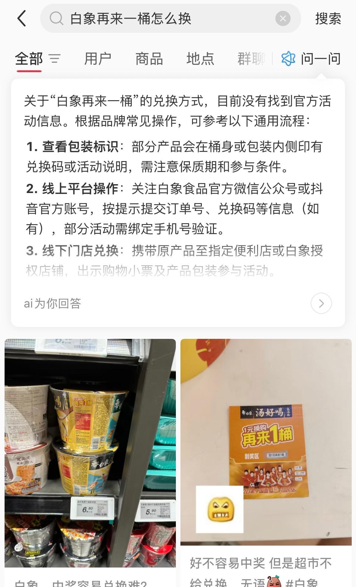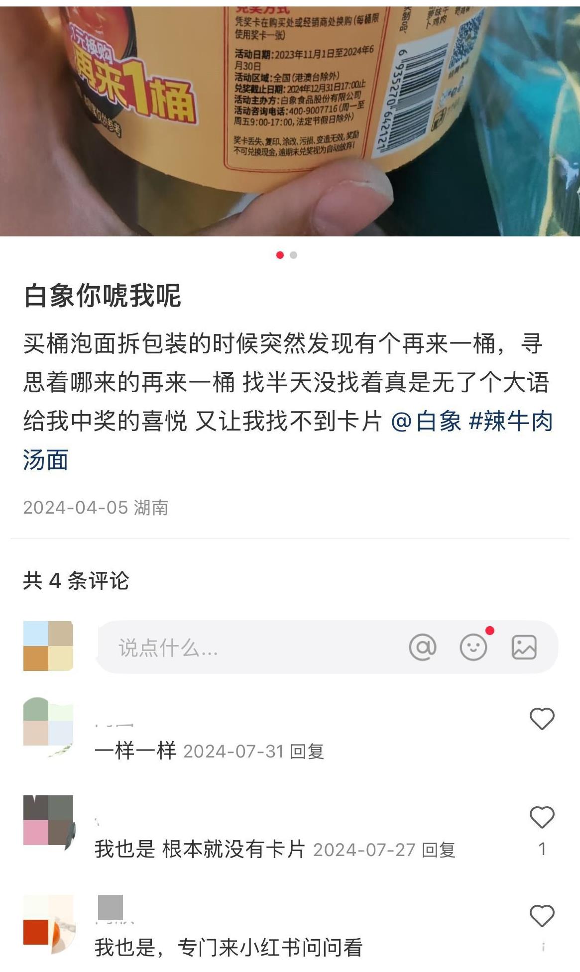 白象这个“再来一桶”活动挺会玩文字游戏。在闪购买了桶面,乍一看包装上说打开有机会再来一桶。正当我寻思线上买该怎么兑换时,下一秒就给我整笑了。 打开除了调料包就是一个划开的空塑料袋,压根没有卡片刮奖。仔细一看包装内容,写着的是“打开包装即有机会获得奖卡一张”,“刮开刮奖区,即有机会中奖”,双重门槛有没有?原来我连第一道抽奖门槛都还没摸着呢!而且再来一桶旁边有行小字写着“1元换购”,并不是免费获得。 去搜了一下,有不少小伙伴有一样的疑惑,看来大家都是被第一眼的“再来一桶”的打字给迷惑了,没有仔细去看规则。再看这兑换规则也挺麻烦的,白象的泡面我还挺喜欢吃的,但是一个活动搞得这么重重把关,实属没必要了,活动策划是用脚想的方案嘛。 #今日所见所闻#