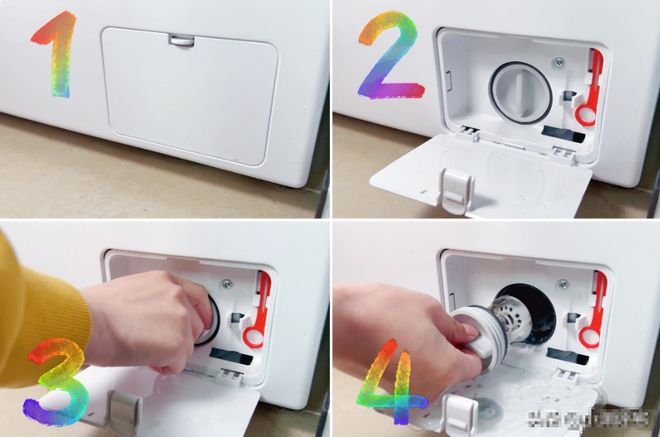 滚筒洗衣机的过滤网,就安装在右下角,这里有个小盖子▼