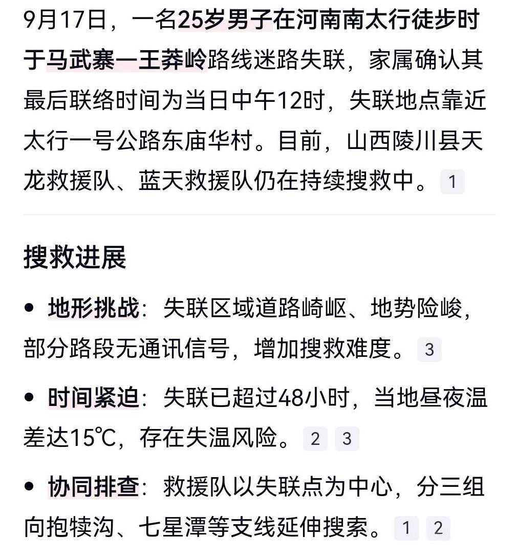 令人担心,这真是敲响了警钟。 一个人千万不要缺危险的地方徒步,特别是那些深山老林,很容易迷路的,有可能走不出来。 9月20日在网上看到这么个消息。 25岁小伙南太行徒步失联,失联时间为9月17日。 昼夜温差高达15度。 如果人体失温的话,那就不敢想象了。 希望有奇迹发生。#25岁小伙南太行徒步失联#