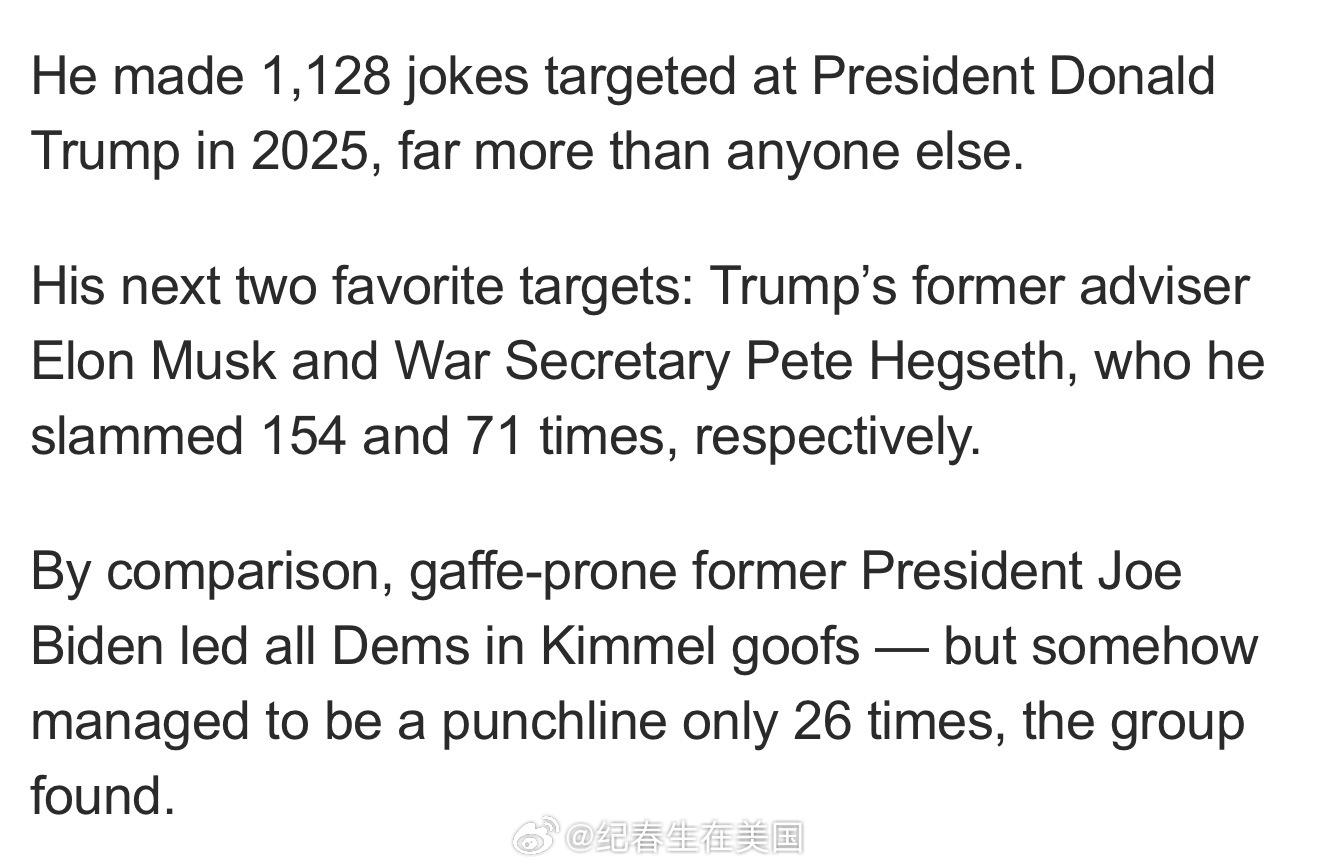 媒体监督机构NewsBusters一项研究结果显示,光是2025 年,Jimmy Kimmel就拿川普开了1128 次玩笑。排在他之后的是马斯克和国防部长 Pete Hegseth,分别被吐槽154 次和 71 次。