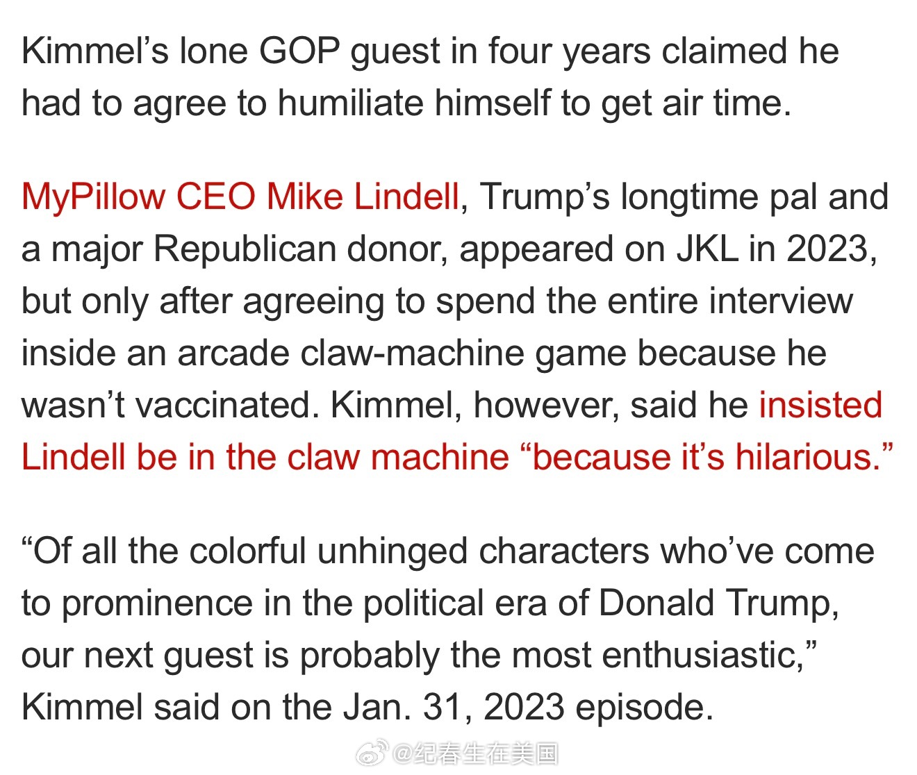 Kimmel 四年来唯一的一位共和党嘉宾是MyPillow的CEO Mike Lindell ,他必须同意自我“出丑”才能上节目。Lindell在 2023 年上过”Jimmy Kimmel Live!”,但前提是答应整场采访都待在一个街头娃娃机里,因为他没有打疫苗。Kimmel 说,他坚持让 Lindell 待在娃娃机里,“因为这样才好笑。”