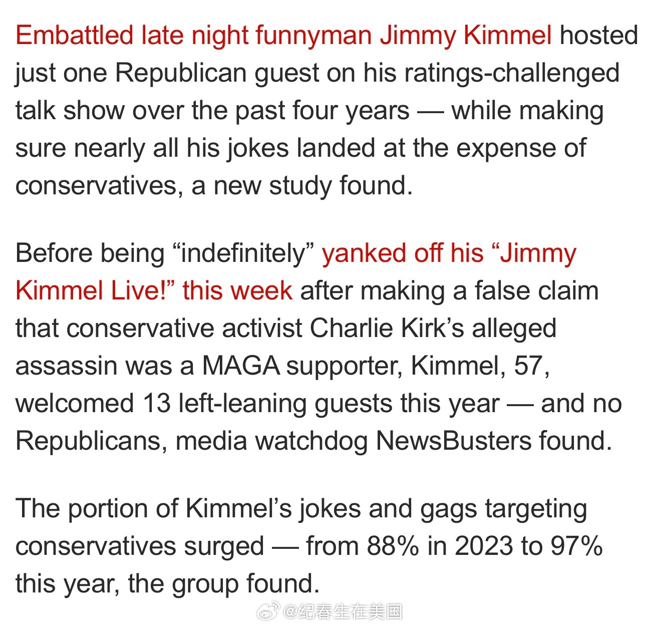 Kimmel 针对保守派的笑话比例近几年飙升,从 2023 年的 88% 升到今年的 97%。