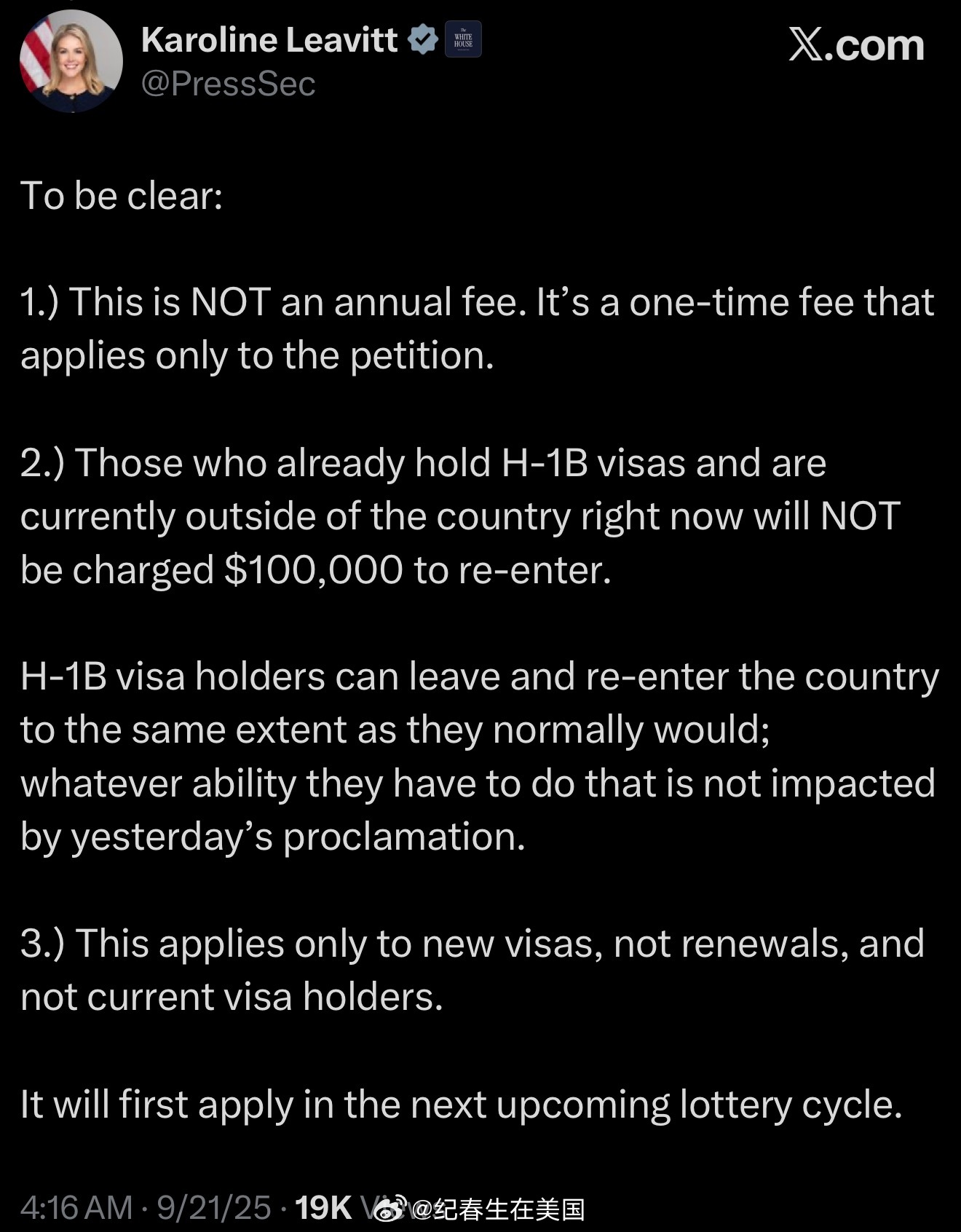 “一些企业律师和别有用心的人正在围绕川普的 H-1B 公告制造大量假新闻,但事实是: