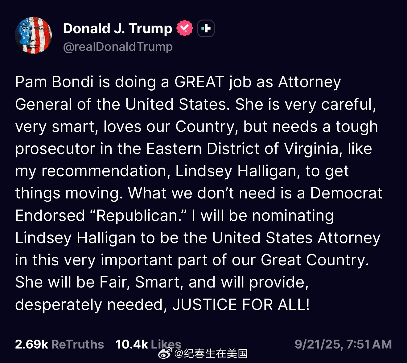 川普对司法部长Bondi打击民主党政治对手不力拖拖拉拉、干说不动表示不满,并极力推荐并将提名Lindsey Halligan成为弗吉尼亚州东区联邦检察官。