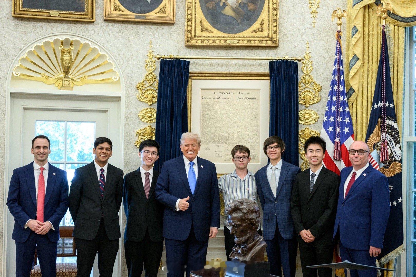 川普今天在白宫接见美国物理奥林匹克世界冠军团队。在今年7月的国际物理奥林匹克竞赛
