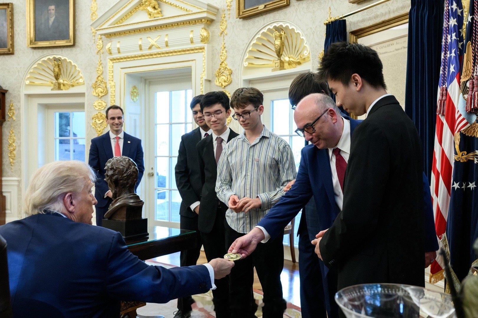 川普今天在白宫接见美国物理奥林匹克世界冠军团队。
