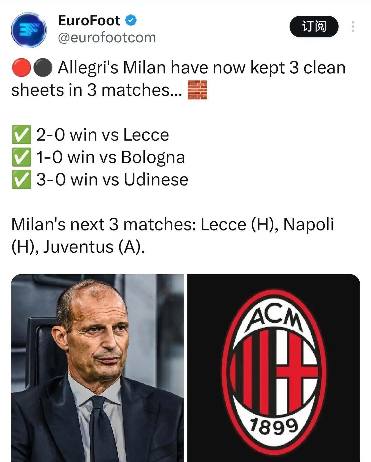 阿莱格里期待米兰未来几场比赛可以继续零封对手,其实说啥未来几场比赛,直接说期待米