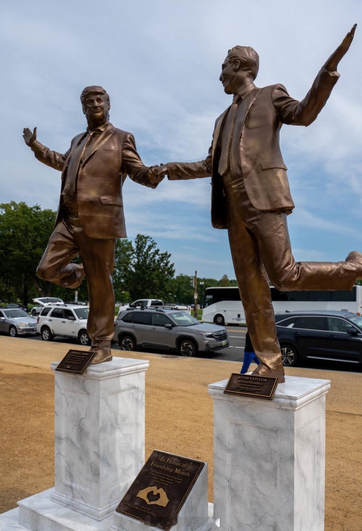 周二清晨,华盛顿国家广场的国会大厦前出现一座名为“Best Friends Forever”的雕像,内容是川普和爱泼斯坦手牵手,铭牌写着:“纪念友谊月:我们赞颂川普总统和他‘最亲密的朋友’杰弗里·爱泼斯坦之间持久的情谊。” [流鼻血]