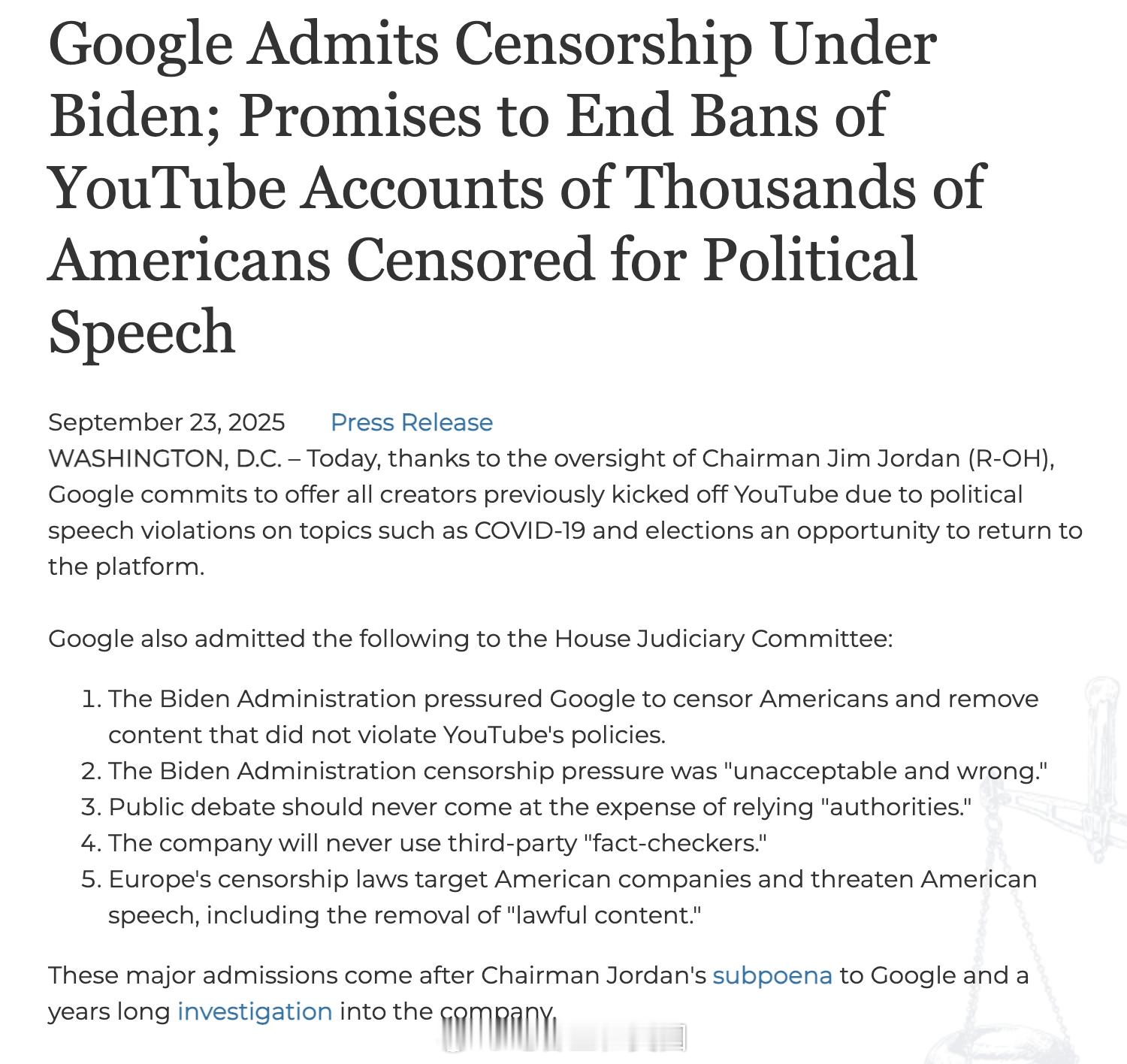 众议院司法委员会也发出声明,表示谷歌承认在拜登任内进行过审查,谷歌还向众议院司法委员会承认: