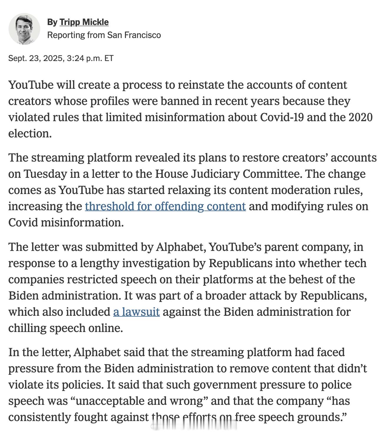 YouTube今天宣布将允许此前因违反新冠和2020年大选错误信息规则而被封禁的创作者账号恢复。母公司Alphabet在给众议院司法委员会的信中强调,公司曾抵制拜登政府要求删除合法内容的压力,称这种干预“不可接受”。Alphabet 重申了对言论自由的承诺,表示不会屈服于政治压力,并强调保守派创作者在公共讨论中扮演重要角色。