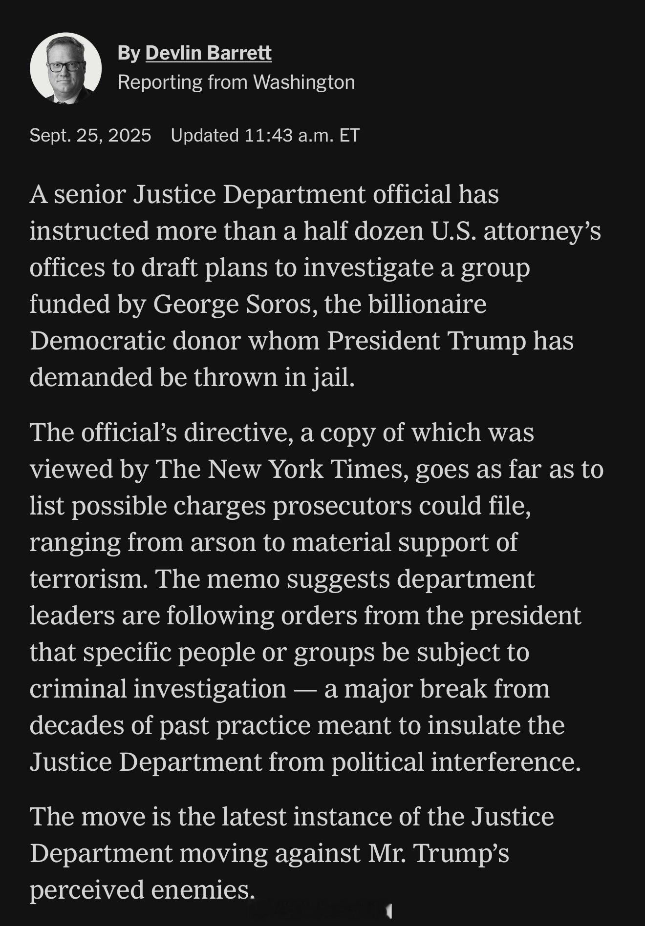 司法部高层在川普的压力下,已指示美国多个联邦检察官办公室制定计划调查George Soros资助的组织,并提出可能的严重指控。看到列出的潜在指控从纵火到支持恐怖主义不等。