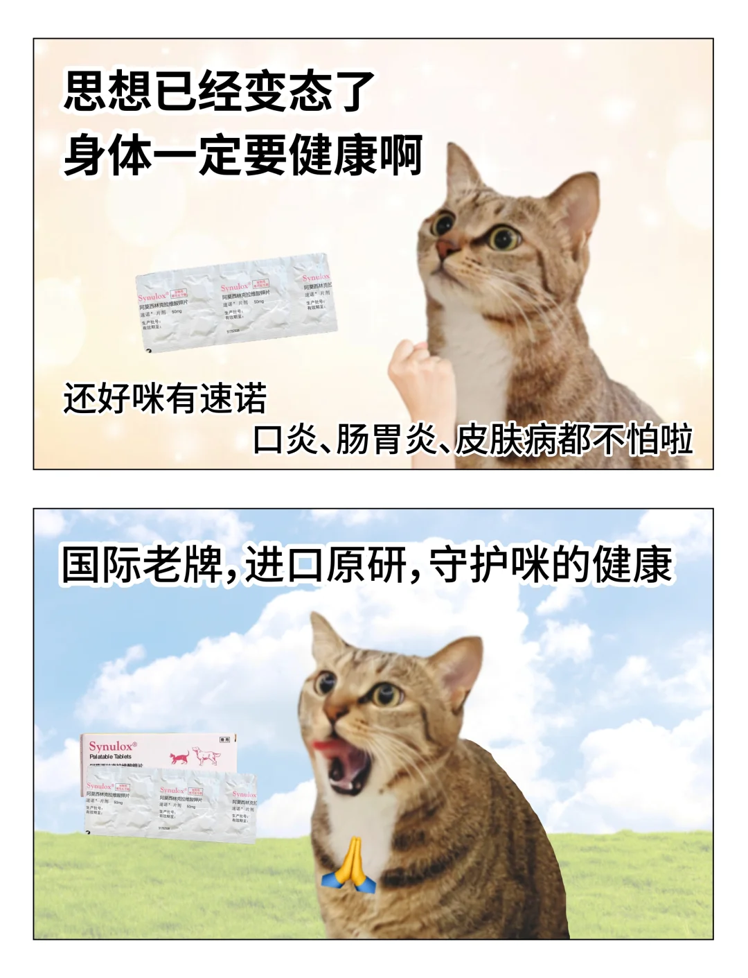 思想虽然已经挺变态了,但身体一定要扛住啊!还好咪有火火症的情况,就会吃老朋友速诺,进口原研,守护咪的每日健康!像咪之前感冒,不仅打喷嚏,鼻涕更是流不停。但是吃了妈从宠物🏥带回来的速诺后,没多久就又蹦蹦跳跳啦,效果又快又稳!虽然速诺成分是阿莫西林,但不是人吃的那个哦~猫狗代谢和人的差别很大,吃人用的可能会影响我们的身体,所以要选专为我们咪和汪研制的速诺!如果有同样困扰,记得先就诊然后在宠物大白的建议下试试速诺,合理用药~现在家里有速诺常备,咪和妈都安心!稳稳抗🦠,口炎、肠胃炎、皮肤病等等都不怕啦~