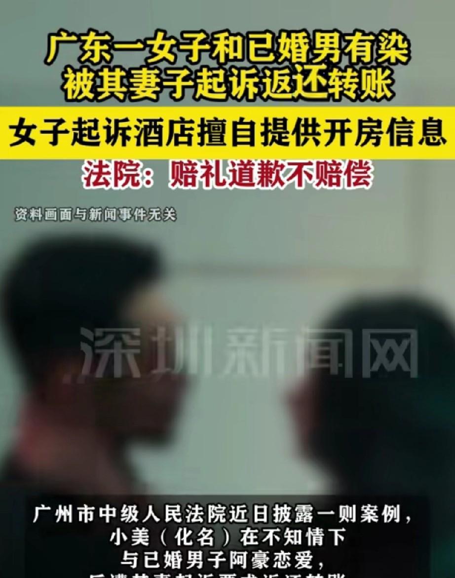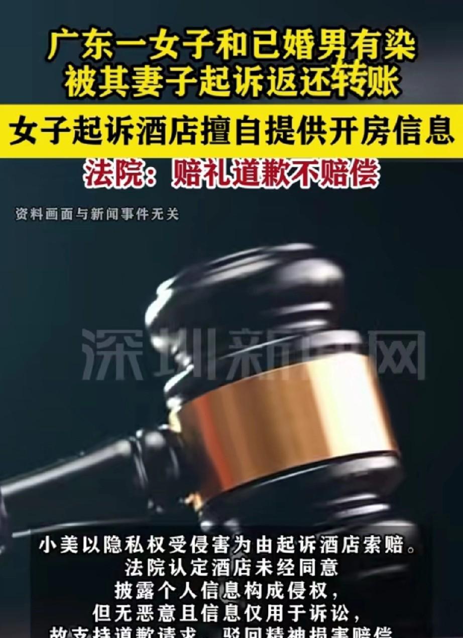 广东广州,女子对男子第一印象不错,又得知他单身,两人很快成为恋人,约会、看电影,还经常去酒店过夜。谁知没多久,另一女子找上门来,骂女子不道德,还要她立刻还钱。女子这才知道,自己被骗了,男子妻子早有家室。女子认为自己被骗才是受害者,不肯还钱,谁知男子翻脸不认账,还带着妻子去酒店要来了他两的住宿记录 并且当做证据提交到法庭上。女子的完整信息被泄露,她顿时崩溃,一纸诉状将酒店告上法庭,要求道歉并赔偿,法院的判决让人意外。 据深圳新闻网9月26日报道,一次偶然的机会,小美认识了赵某。赵某长得阳光帅气,说话又幽默风趣,一下子就吸引了她。 两个人聊得投机,就互相留了联系方式。聊天中,赵某说自己单身,小美正好也没有对象,两人就试着相处看看。 没想到感情升温很快,没多久就正式确定了恋爱关系。 那段时间,小美觉得特别甜蜜,赵某不仅经常约她看电影、吃饭,还很大方,时不时给她转账,说这是表达爱意。 两人感情越来越好,也经常一起去酒店过夜,小美一度以为,这段感情能一直走下去,甚至想过步入婚姻殿堂。 可万万没想到,有一天,一个陌生女人突然找上门来,一见面就骂小美不道德,还要求她把赵某给的钱全部退回去。 小美这才得知,赵某根本不是单身,他已经结婚了。 这让她又气愤又委屈,自己真是个傻瓜,被骗的团团转。 而且,明明是赵某隐瞒婚姻在先,自己也是受害者,该发生的都发生了,没向他索赔都算好了,凭什么找自己退钱,想得美。 但更让她没想到的是,赵某翻脸比翻书还快,见小美不肯退钱,他竟然和妻子一起跑到之前两人住过的酒店,自行打印出了他们的住房记录。 记录上清楚显示了,开房的日期、天数,还有小美完整的身份信息。 这份没有打码的个人信息,还被赵某的妻子当成证据提交给了有关部门。 小美知道后彻底怒了,不久前赵某还跟她甜言蜜语,热情缠绵,没想到一转眼,就跟老婆联手坑自己,这算什么男人? 小美咽不下这口气,一纸诉状把酒店告上法庭,她认为酒店未经她同意就泄露自己的隐私信息,侵犯了她的隐私权,要求酒店赔礼道歉并赔偿精神损失。 有人觉得,小美虽然有不妥,但她是在不知情的情况下“被小三”的,错更大的明明是赵某。他们夫妻俩联手要钱,简直就是白嫖,太不讲武德了。 也有人表示,妻子查丈夫的住房记录有什么错?酒店最后还要道歉,这不是变相鼓励出轨吗? 法院会如何判决呢? 不过,由于酒店没有恶意,信息也只是用于诉讼。 根据《消费者权益保护法》第29条规定:经营者及其工作人员对收集的消费者个人信息必须严格保密,不得泄露、出售或者非法向他人提供 。 酒店作为经营者,在未取得小美同意的情况下,向赵某披露其住房信息,违反了该法条规定,构成对小美隐私权的侵犯。 由于酒店的行为侵犯了小美的隐私权,根据《民法典》第1000条规定:行为人因侵害人格权承担消除影响、恢复名誉、赔礼道歉等民事责任的,应当与行为的具体方式和造成的影响范围相当 。 因此,酒店需要向小美道歉。 综上,法院判决,酒店需要向小美道歉,但没有支持她要求精神赔偿的请求。 关注@亚伟说法 ,多学法律,少走弯路!