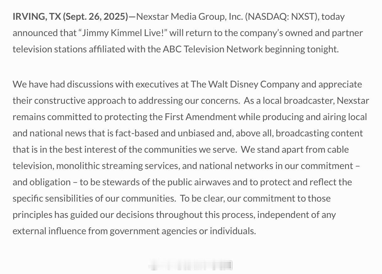 Sinclair和Nexstar今天陆续宣布,今晚开始将恢复播放”Jimmy K
