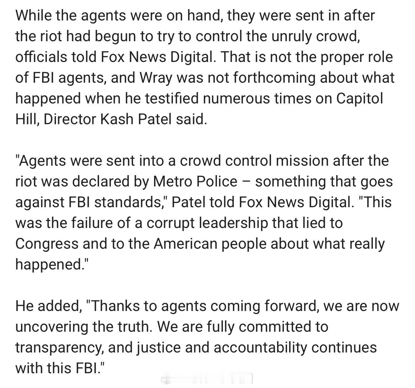川普在文中声称,1/6国会骚乱前后,联邦调查局探员混入人群,并充当煽动者和暴徒,并呼吁公开这些探员在当天的角色。Patel随后在接受Fox News采访时表示,川普的说法不正确。他指出,当天并没有274名联邦探员在骚乱开始前混在人群中,他们是在骚乱爆发、示威者试图强行闯入国会大厦后,才进入现场进行人群控制的。