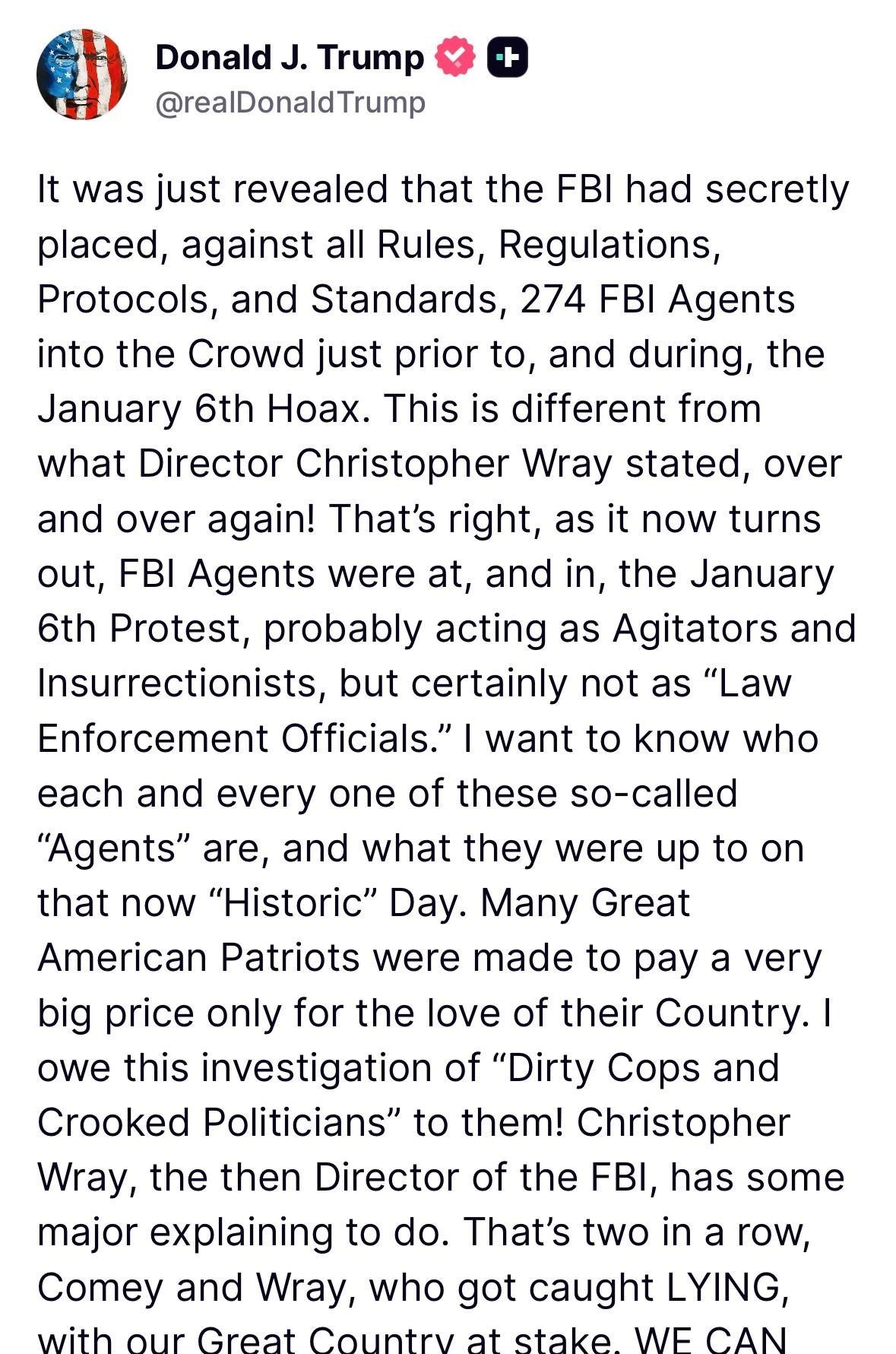 科米终于被起诉,将面临陪审团两项罪名审判。追诉期将在这个月底过期,川普直接发文说司法部不作为,才有了赶在过期前起诉。另一项更大的事,2020年大选作弊,追诉期将在十一月过期,如果司法部没有在过期前起诉,将永远不能追究大选作弊。 这事正在积极推进中 昨日,特朗普再发文督办。 称最近曝出,FBI秘密向“1月6日骗局”现场安插了274名FBI探员,就在事发前和事发时混进人群!在“1月6日抗议”中,FBI探员极有可能扮演煽动者、闹事者,而绝非“执法人员”。 特朗普写道,我要求彻查这些所谓的“探员”是谁,他们在那一天究竟干了什么。时任FBI局长克里斯托弗·雷必须作出重大解释。 这已经是连续两位,科米和雷,被当场抓到撒谎,我们绝不能让这种事情在美国重演! 决心已定,所有涉事人员都有可能面临法律制裁。