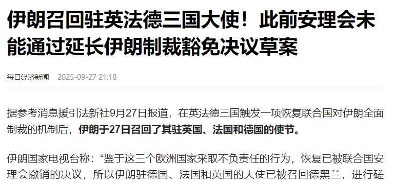一个软弱的伊朗,这回付出代价了吧! 9月26日,联合国关于制裁的投票里,中俄都呼吁大家谨慎对待,但最终恢复制裁的决议还是通过了。 面对这个结果,伊朗召回了驻英、法、德的大使,这是一个国家坚持自己立场、表达不满的正常做法。毕竟换成任何一个主权国家,遇到这样的事都不会无动于衷。 其实伊核问题说穿了一点都不复杂,关键就是伊朗能不能合法地用核能搞民生。 根据《不扩散核武器条约》,只要成员国不搞核武器,就有权利和平利用核能,这是国际上都认可的规矩,伊朗的要求完全在理。 这些年伊朗一直说自己不会造核武器,核活动都是为了民用,比如给国内核电站供燃料发电,这一点国际原子能机构之前也多次核查确认过。就像2015年联合国通过的2231号决议,本来都认可了伊朗核问题的解决方案,可现在局势又走了回头路。 然而,光靠制裁施压根本解决不了问题,反而会让矛盾越来越深。这次恢复制裁后,伊朗的能源出口肯定会受影响,老百姓需要的物资进口也会更难,但这并不会让伊朗放弃自己的合法权利。 更麻烦的是,现在谈判的路子都快被堵死了。本来伊朗和美国上半年谈了四轮,和英法德也有谈判渠道,今年8月还跟国际原子能机构达成了核查协议。可制裁恢复后,这些谈判要么中断要么暂停,这样下去军事冲突的风险都会变大,这对地区稳定可不是好事。 说到底,解决问题还得靠坐下来谈。国际社会应该重新回到对话桌前,尊重伊朗和平用核能的权利,通过平等协商找到大家都能接受的办法。 毕竟2015年的协议已经证明,对话能找到出路,现在把这条路堵死实在不明智。动辄就用制裁,把问题政治化,既不符合多边合作的大趋势,也解决不了根本矛盾。 只有建立起互信,保障各方的合理关切,才能让伊核问题真正得到长治久安的解决,这才是对地区和世界都负责任的做法。
