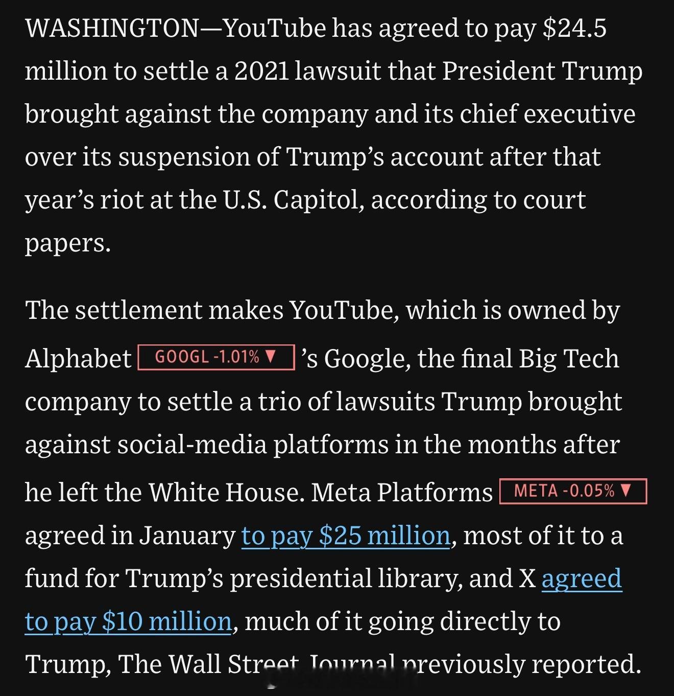 YouTube同意支付支付2450万美元,了结川普就2021年国会骚乱后账号被封提起的诉讼。