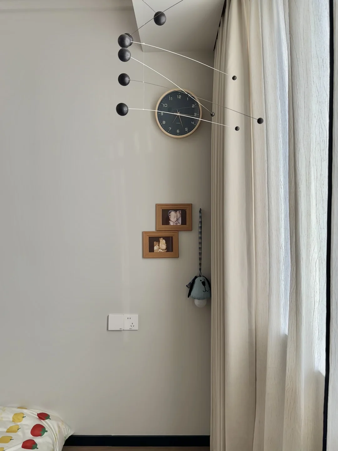 各种彩色的玩具🚘在窗帘营造的低饱和度氛围里格外亮眼