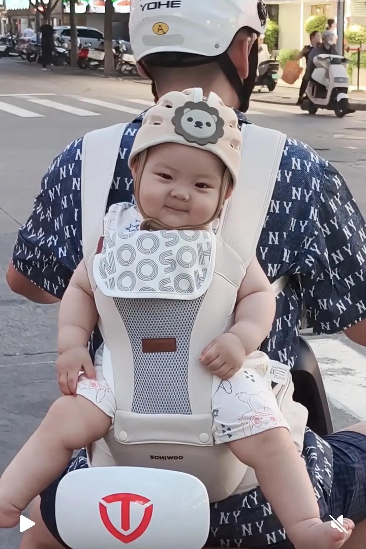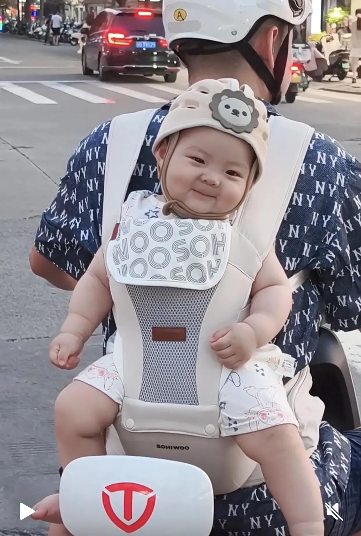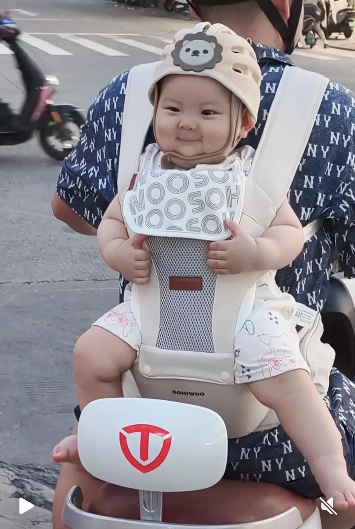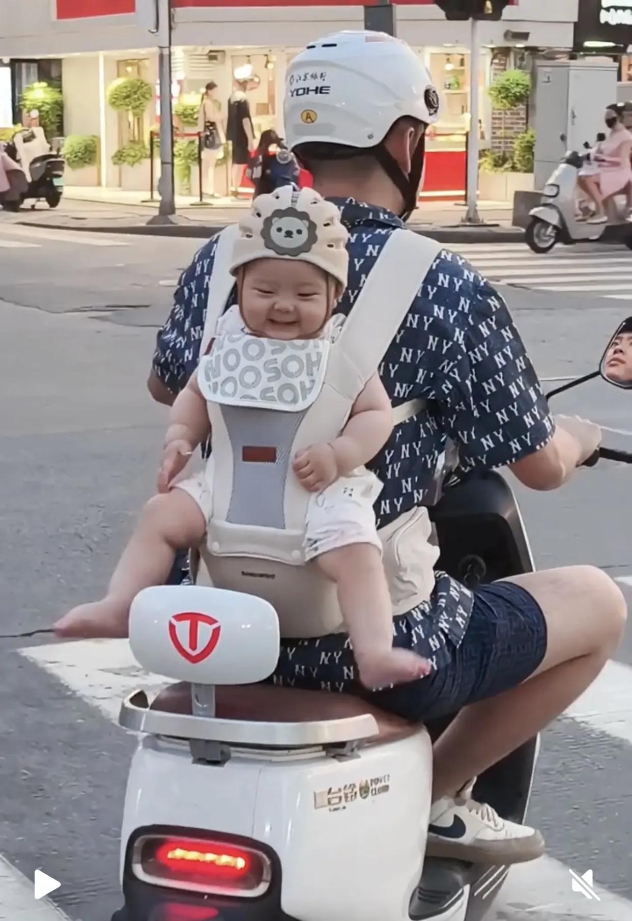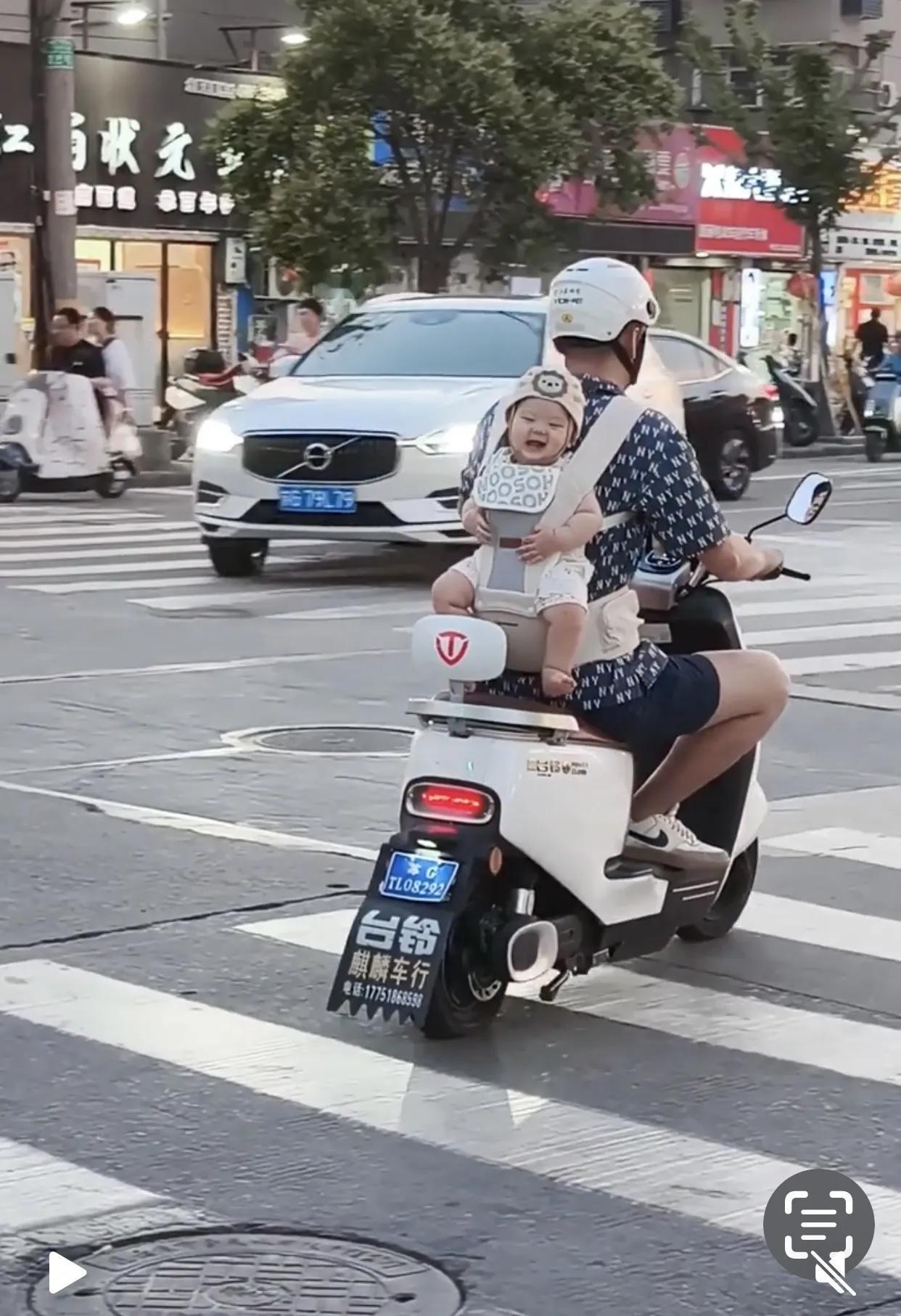 网友: 上班路上看到的,这爸比太有安全意识了,小家伙带安全帽简直是萌化了![捂脸]