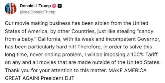 特朗普要对在美国之外制作的任何电影征收100%关税。