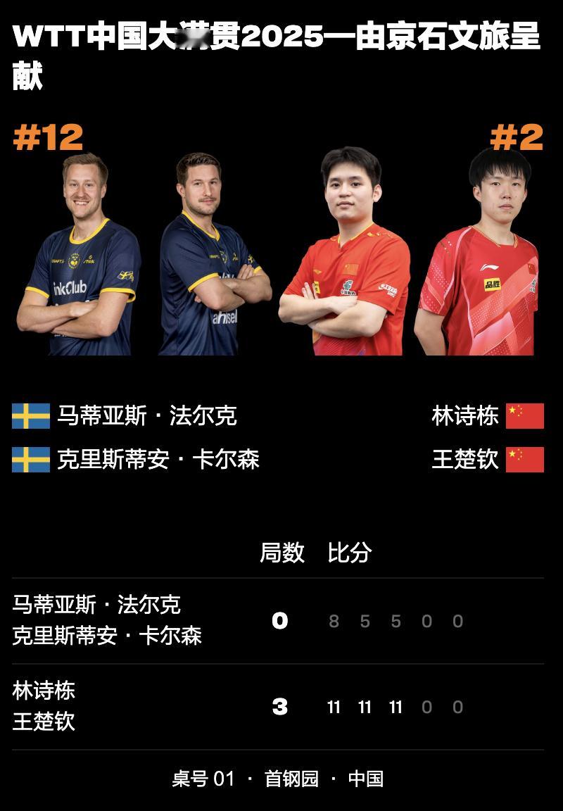 林诗栋王楚钦仅用时22分钟就结束战斗 刚刚结束的男双八分之一比赛,林诗栋王楚钦组合3比0光速战胜瑞典组合,轻松进入八强,稍晚王楚钦将迎来今天的第三场比赛,他将搭档孙颖莎对阵陈垣宇、蒯曼组合。