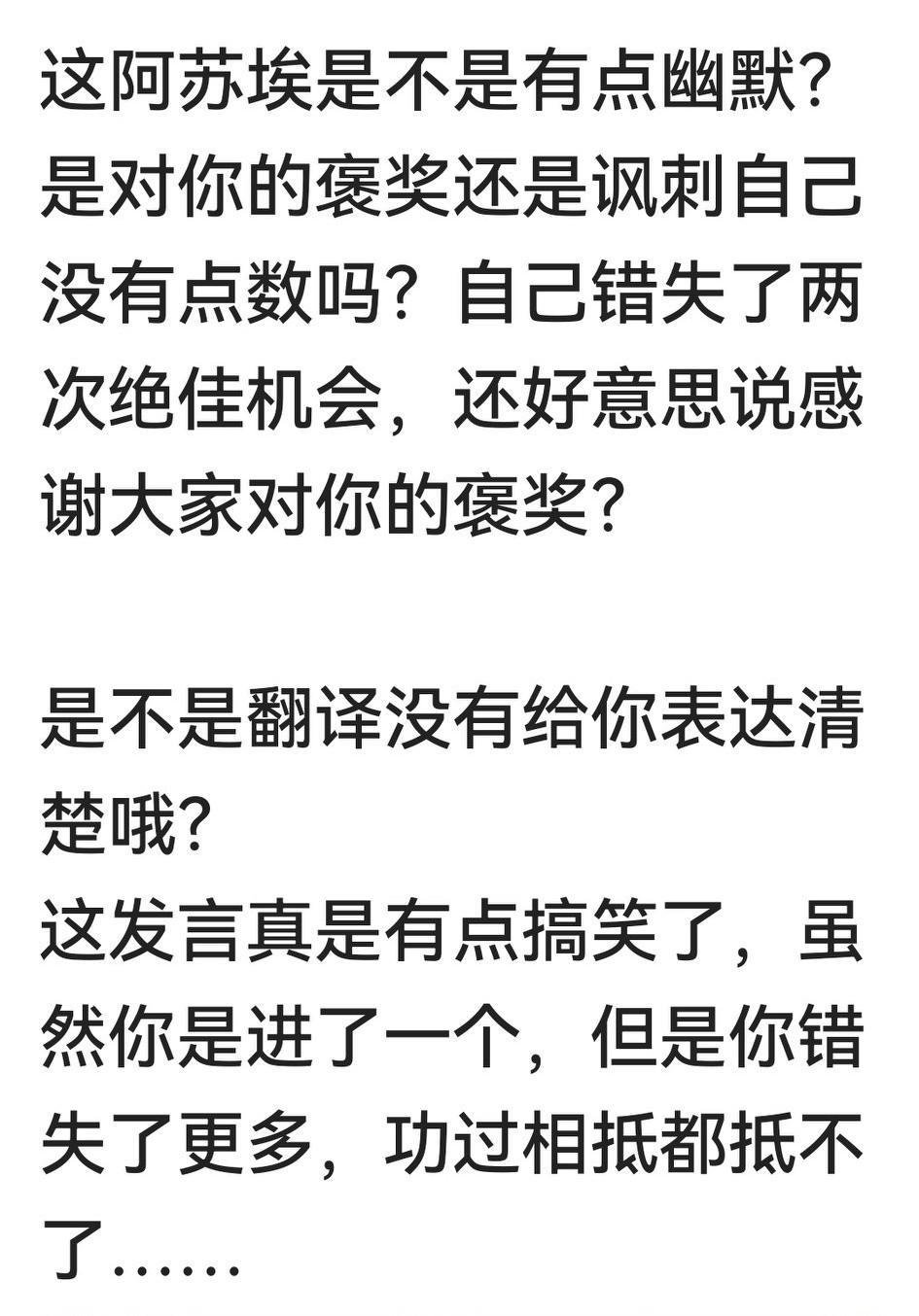 人倒霉了,哪怕建了功也仍遭人说。阿苏埃无疑是昨天亚冠赛场的风云人物:打入申花唯一进球,争得一场平局。他赛后接受采访说“感谢大家的褒奖”,竟有人作讽刺性解读。 人在球场谁没失误?可一些人不去评他进球的精彩,不去遗憾他被黑的点球,偏说他错失两个单刀,反复强调其体能不足,还有人怀疑其年龄造假,这就是走极端的心生厌恶。如果他没体力没速度哪来的两个单刀?如果他不前插跑位哪来的进球?那么多人都不进球,凭什么对他这进球者说不? 阿苏埃下场即受访,其褒奖说显然来自于场上的队友,自然不是场外的讥讽。所幸他不懂中文,不知网上说什么,否则可能被气得哭。