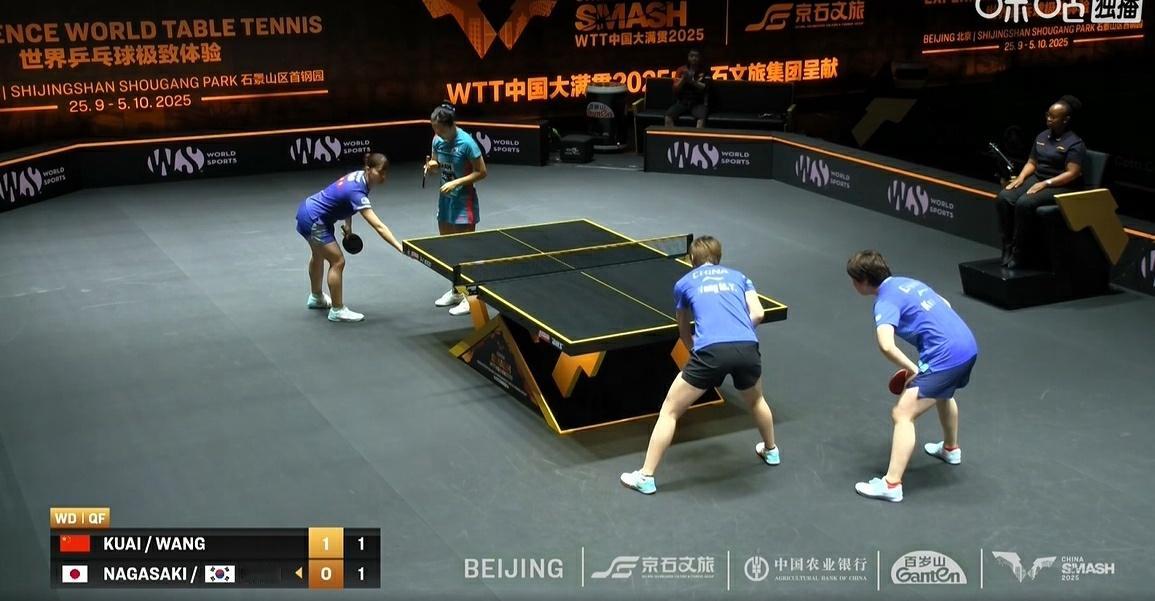 WTT中国大满贯女双1/4决赛,王曼昱/蒯曼亮相,对阵长崎美柚/申裕斌。 首局比赛,王曼昱/蒯曼11-7拿下,大比分1-0!