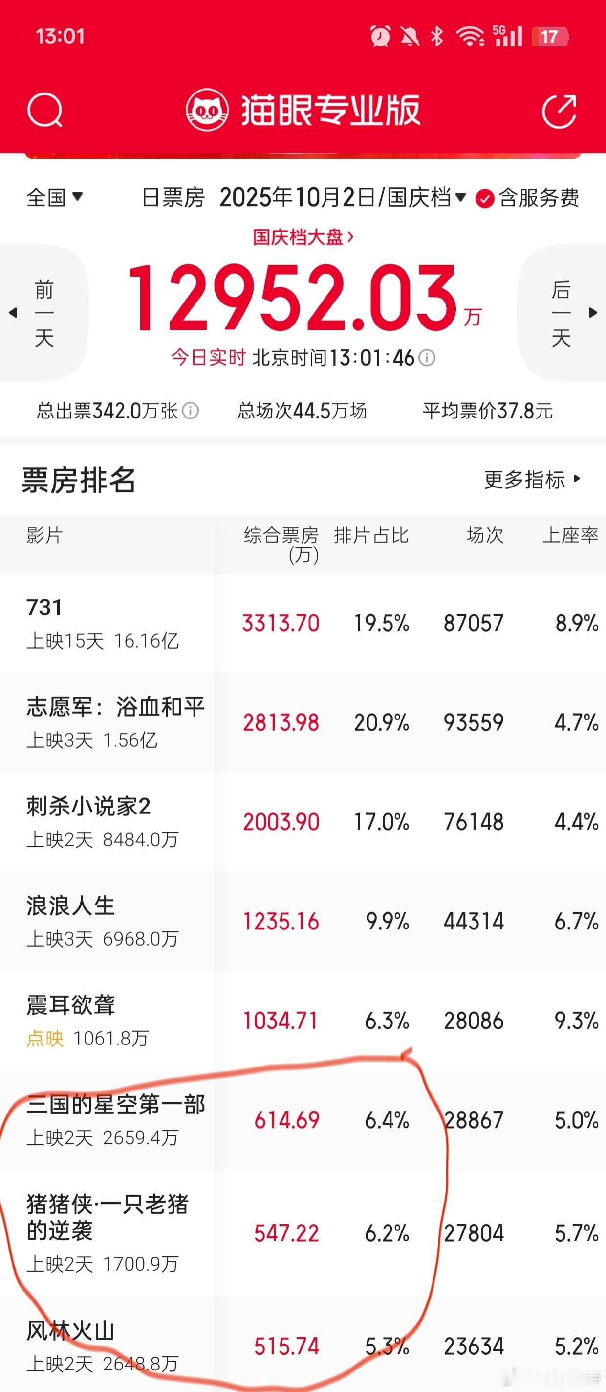 听听温特怎么说《三国的星空第一部》《风林火山》《猪猪侠》一个梯队日排片日票房差不多,看动态都是1000万左右。昨天刚好看了这三部电影[允悲]。