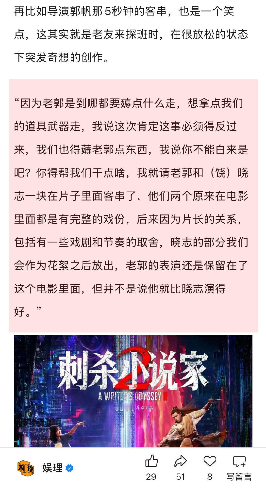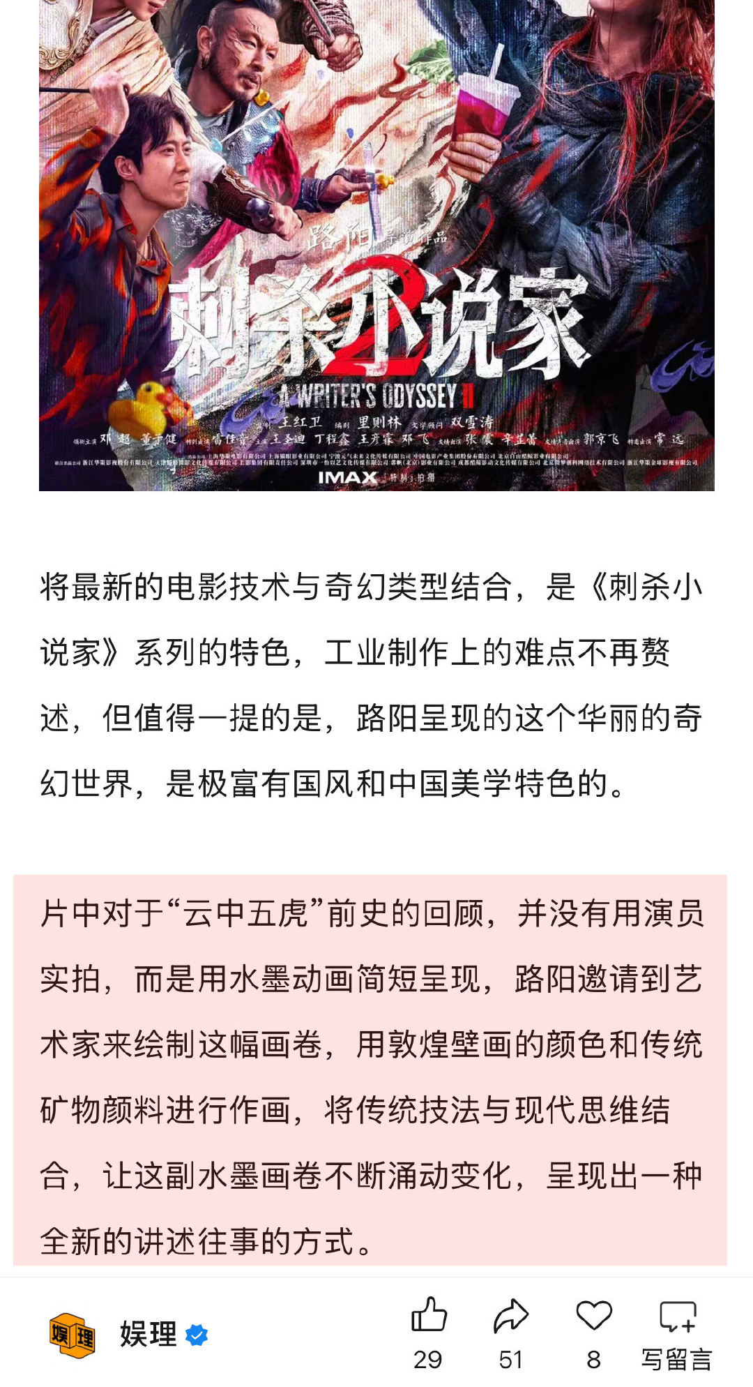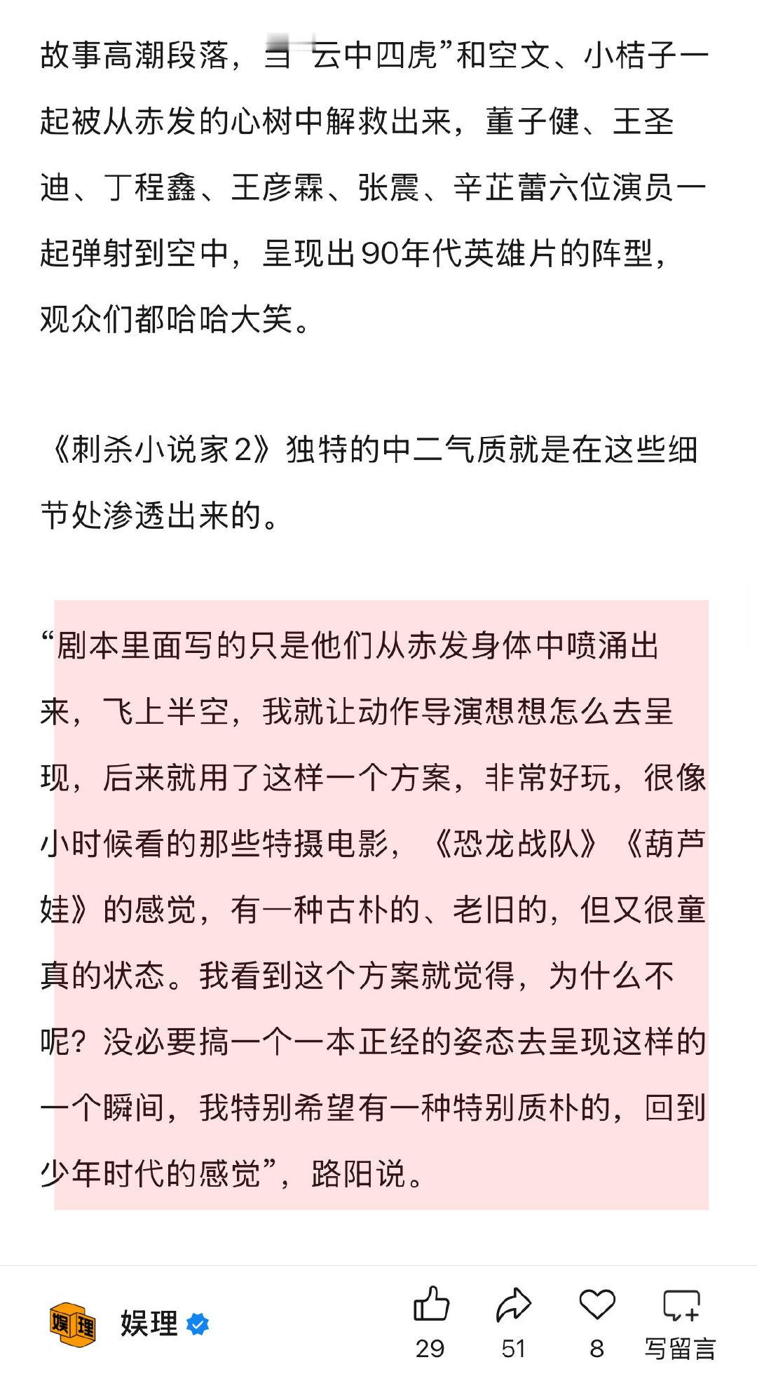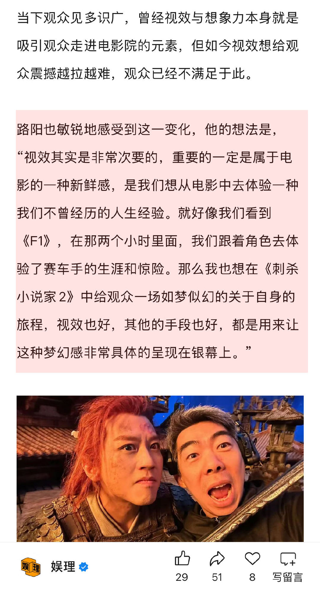 路阳赞丁程鑫表演超出预期 路阳透露刺杀小说家3进度 谈及视效大片在当下已经难以满足观众时,导演路阳表示视效是次要的,重要的是属于电影的新鲜感,“是想从电影中体验一种我们不曾经历的人生经验。我也想在《刺杀小说家2》中给观众一场如梦似幻的关于自身的旅程,视效也好,其他的手段也好,都是用来让这种梦幻感非常具体的呈现在银幕上。”娱理独家↓