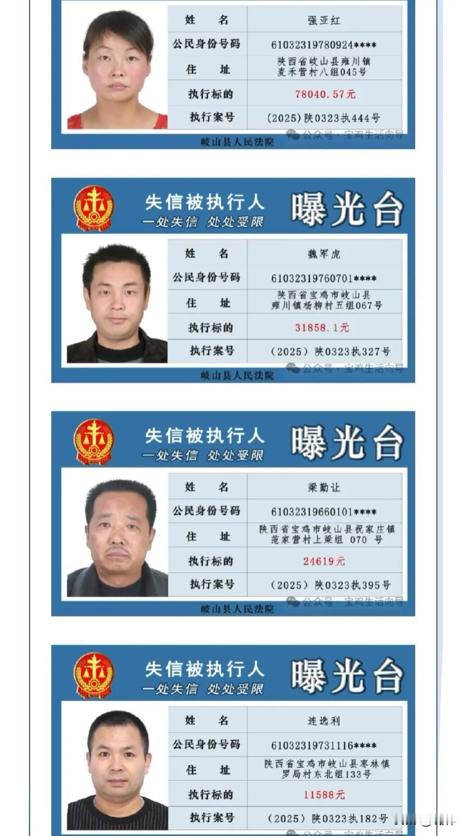 宝鸡这些失信人被曝光! 9月26日,岐山县人民法院公布了一批失信被执行人名单↓↓